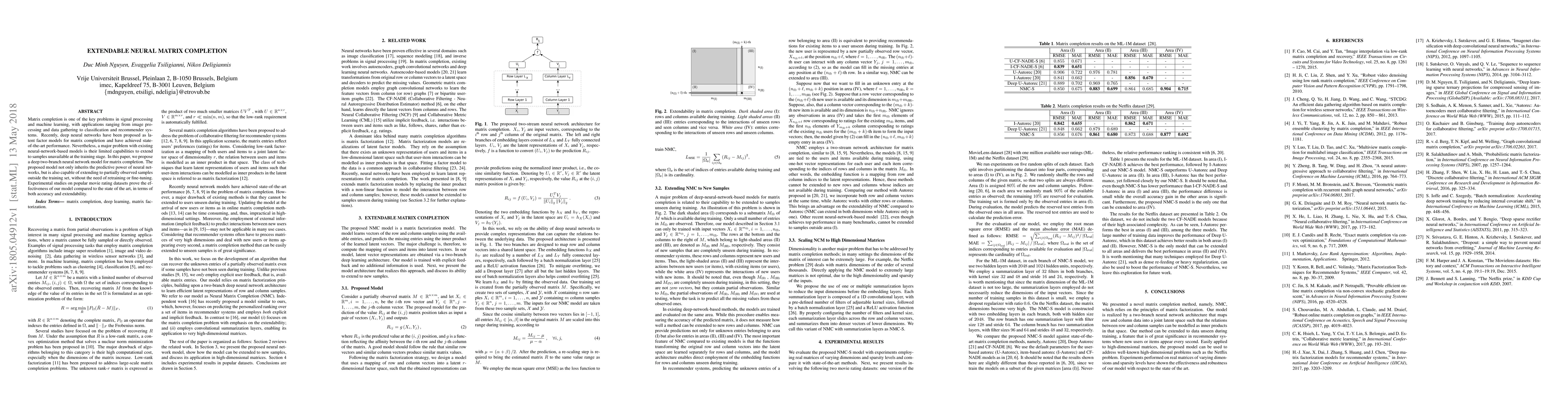 This paper proposes a deep two-branch neural network model for matrix completion that maintains high predictive accuracy while enabling extendability to new, unseen samples without retraining. Experimental results on movie rating datasets demonstrate superior performance compared to existing models.