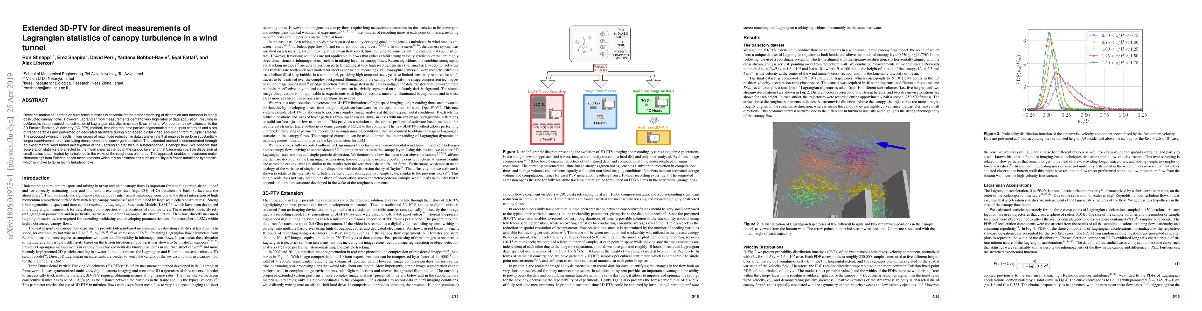 This paper introduces an extended 3D-PTV method for real-time particle segmentation in wind tunnel experiments, significantly reducing data transfer rates and enabling longer runs for measuring Lagrangian turbulence statistics in canopy flows. The method reveals that mean shear and turbulence in the wake of roughness elements influence Lagrangian dispersion and particle acceleration.