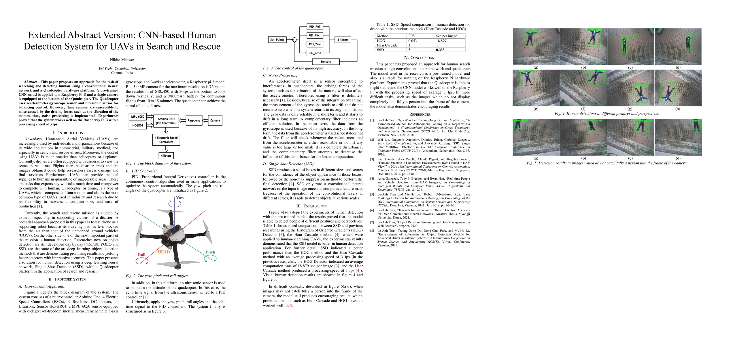 This research proposes a CNN-based human detection system for drones to aid in search and rescue operations, achieving 3 frames per second processing speed on a Raspberry Pi B.