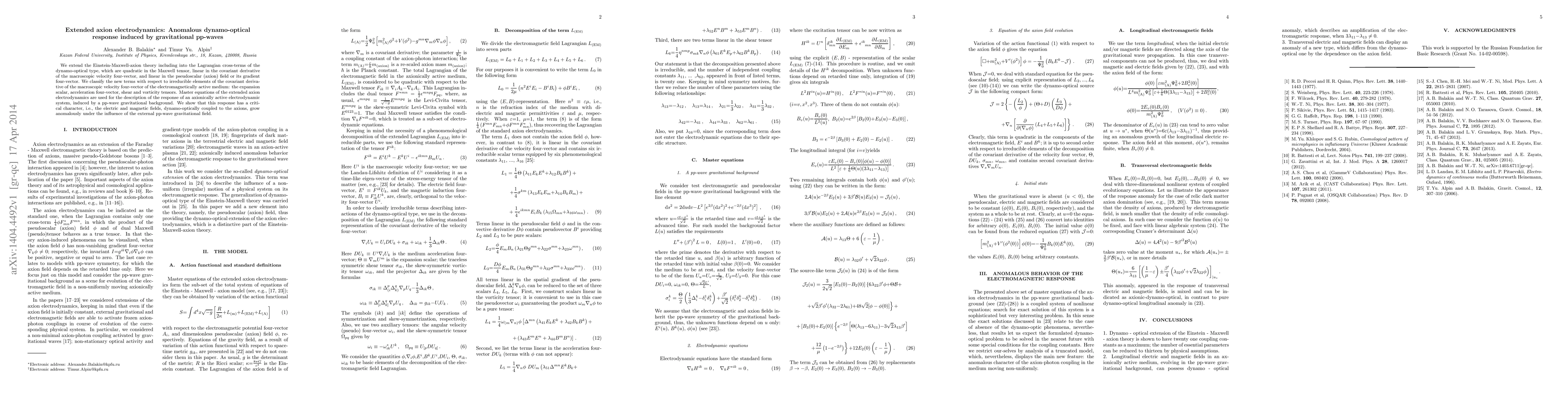 We extend the Einstein-Maxwell-axion theory including into the Lagrangian cross-terms of the dynamo-optical type, which are quadratic in the Maxwell tensor, linear in the covariant derivative of the macroscopic velocity four-vector, and linear in the pseudoscalar (axion) field or its gradient four-vector. We classify the new terms with respect to irreducible elements of the covariant derivative of the macroscopic velocity four-vector of the electromagnetically active medium: the expansion scalar, acceleration four-vector, shear and vorticity tensors. Master equations of the extended axion electrodynamics are used for the description of the response of an axionically active electrodynamic system, induced by a pp-wave gravitational background. We show that this response has a critical character, i.e., the electric and magnetic fields, dynamo-optically coupled to the axions, grow anomalously under the influence of the external pp-wave gravitational field.