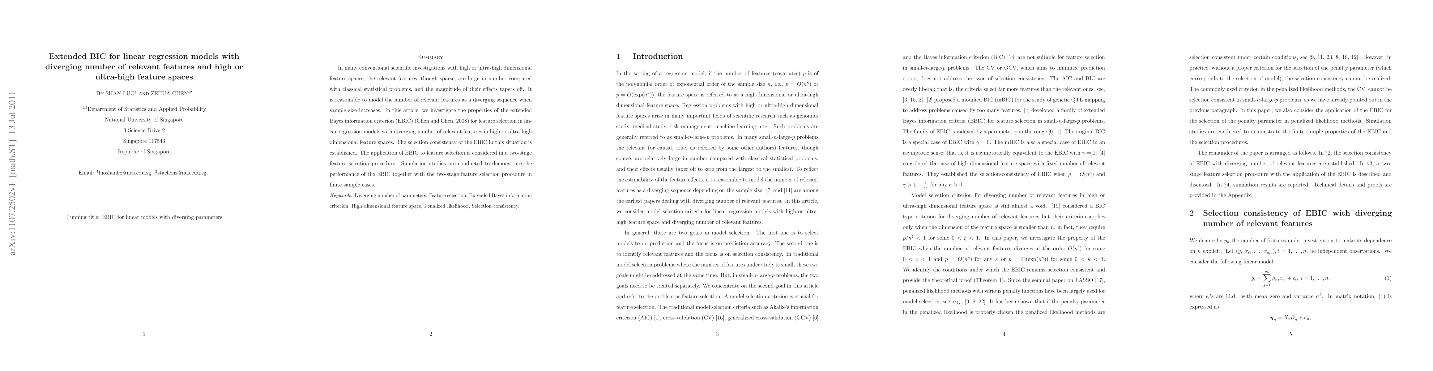 This research paper explores the Extended Bayes Information Criterion (EBIC) for feature selection in linear regression models with a large, diverging number of relevant features in high-dimensional data. It establishes the selection consistency of EBIC in this context and demonstrates its performance through simulation studies in a two-stage feature selection procedure.