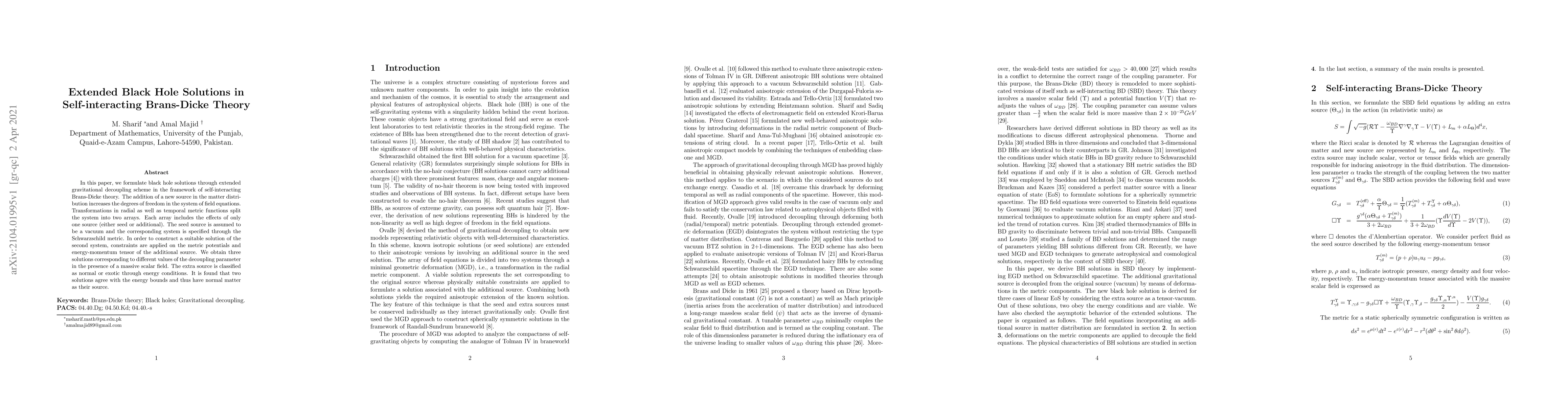 This paper explores extended black hole solutions in self-interacting Brans-Dicke theory using a gravitational decoupling scheme. It derives three solutions, two of which comply with energy bounds, indicating normal matter as their source, while the third may involve exotic matter.