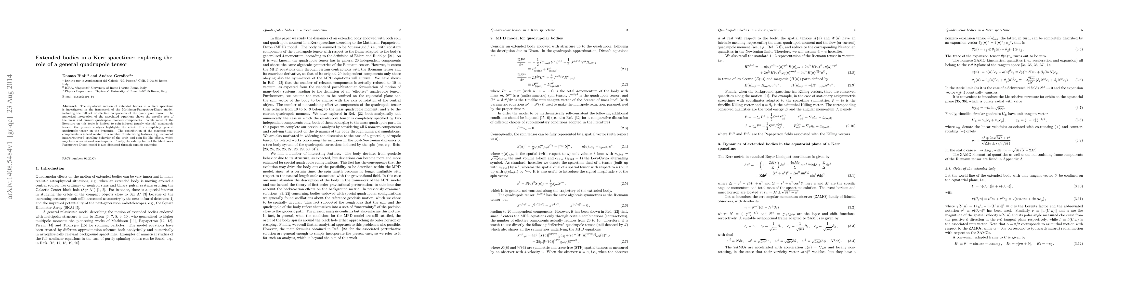 This paper investigates the dynamics of extended bodies in a Kerr spacetime using the Mathisson-Papapetrou-Dixon model, focusing on the effects of a general quadrupole tensor, including both mass and current components. The study reveals significant impacts of magnetic-type components on orbital dynamics, such as enhanced spiraling and spin-flip effects, which could have observational implications.