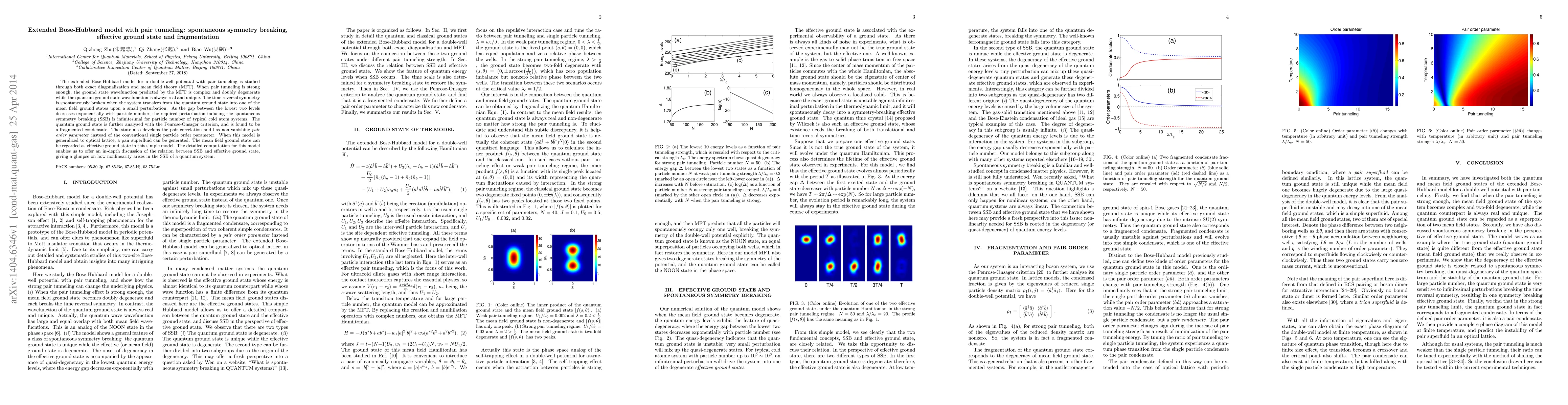 This paper investigates the extended Bose-Hubbard model with pair tunneling, revealing spontaneous symmetry breaking and a fragmented quantum ground state. Mean field theory predicts complex, degenerate ground states, while exact diagonalization shows a unique, real quantum ground state with pair correlations.