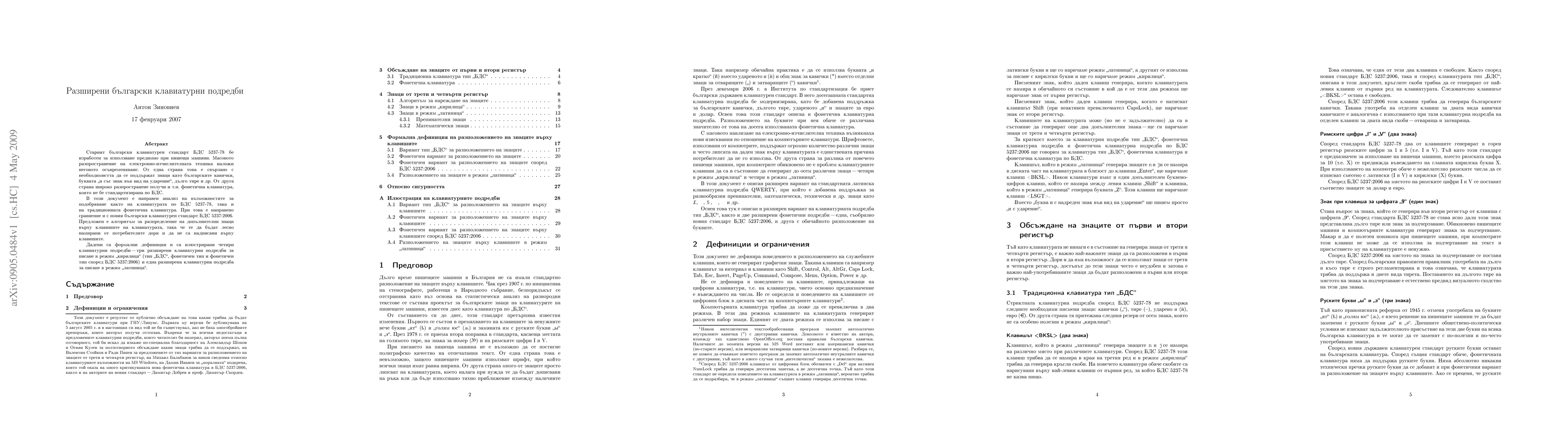 This paper updates the outdated Bulgarian keyboard standard BDS 5237-78 to accommodate modern computer use, including support for additional symbols and the popular phonetic layout. It proposes an algorithm for placing extra symbols on the keyboard, comparing it with the new BDS 5237:2006 standard and presenting four extended layouts for both Cyrillic and Latin typing modes.