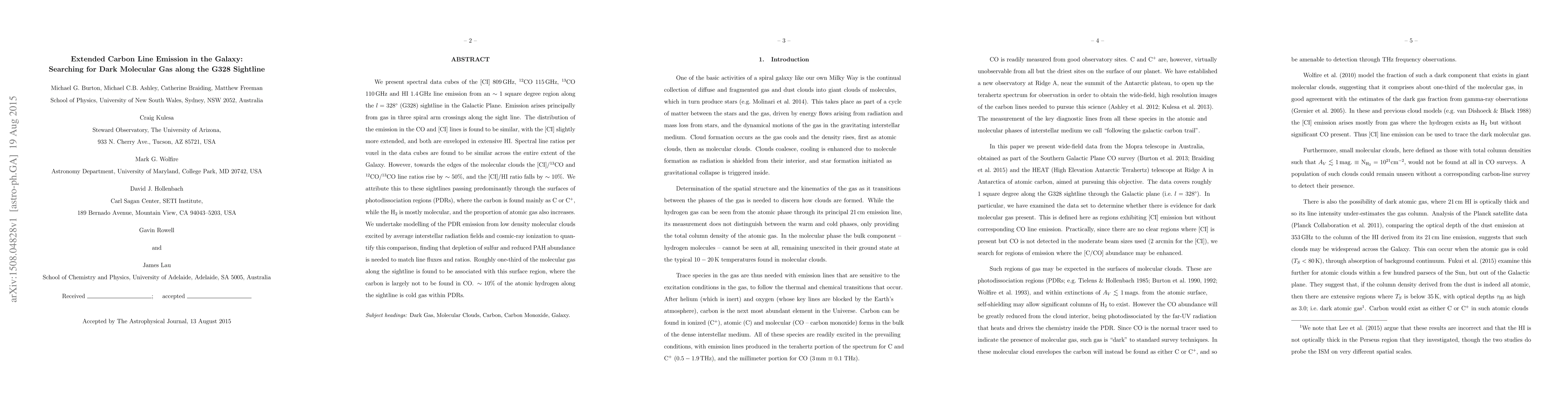 We present spectral data cubes of the [CI] 809GHz, 12CO 115GHz, 13CO 110GHz and HI 1.4GHz line emission from an 1 square degree region along the l = 328{\deg} (G328) sightline in the Galactic Plane. Emission arises principally from gas in three spiral arm crossings along the sight line. The distribution of the emission in the CO and [CI] lines is found to be similar, with the [CI] slightly more extended, and both are enveloped in extensive HI. Spectral line ratios per voxel in the data cubes are found to be similar across the entire extent of the Galaxy. However, towards the edges of the molecular clouds the [CI]/13CO and 12CO/13CO line ratios rise by ~50%, and the [CI]/HI ratio falls by ~10$%. We attribute this to these sightlines passing predominantly through the surfaces of photodissociation regions (PDRs), where the carbon is found mainly as C or C+, while the H2 is mostly molecular, and the proportion of atomic gas also increases. We undertake modelling of the PDR emission from low density molecular clouds excited by average interstellar radiation fields and cosmic-ray ionization to quantify this comparison, finding that depletion of sulfur and reduced PAH abundance is needed to match line fluxes and ratios. Roughly one-third of the molecular gas along the sightline is found to be associated with this surface region, where the carbon is largely not to be found in CO. ~10% of the atomic hydrogen along the sightline is cold gas within PDRs.