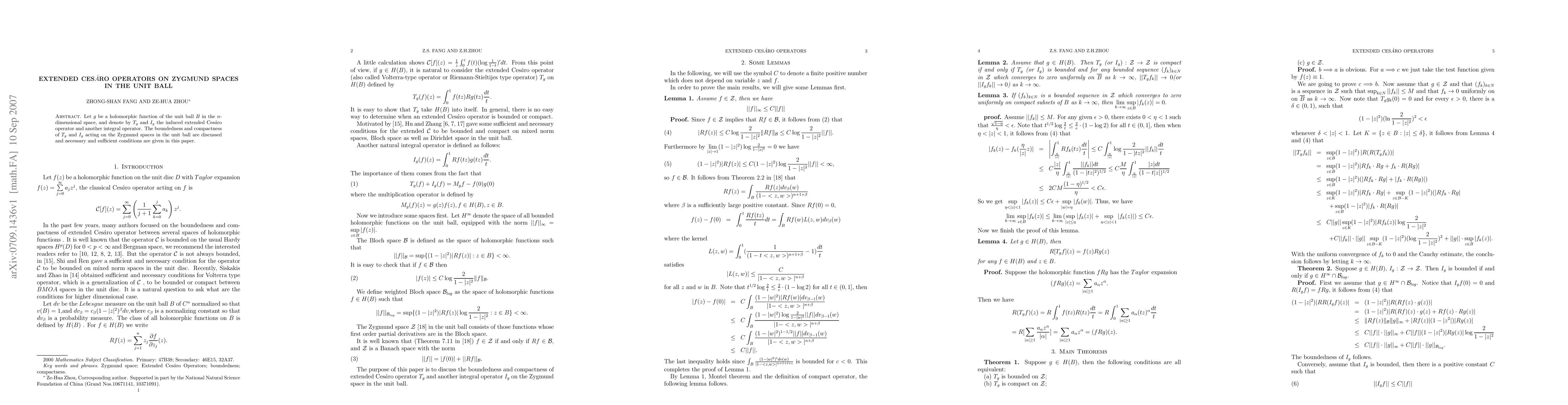 Let $g$ be a holomorphic function of the unit ball $B$ in the $n$-dimensional space, and denote by $T_g$ and $I_g$ the induced extended Ces$\acute{a}$ro operator and another integral operator. The boundedness and compactness of $T_g$ and $I_g$ acting on the Zygmund spaces in the unit ball are discussed and necessary and sufficient conditions are given in this paper.
