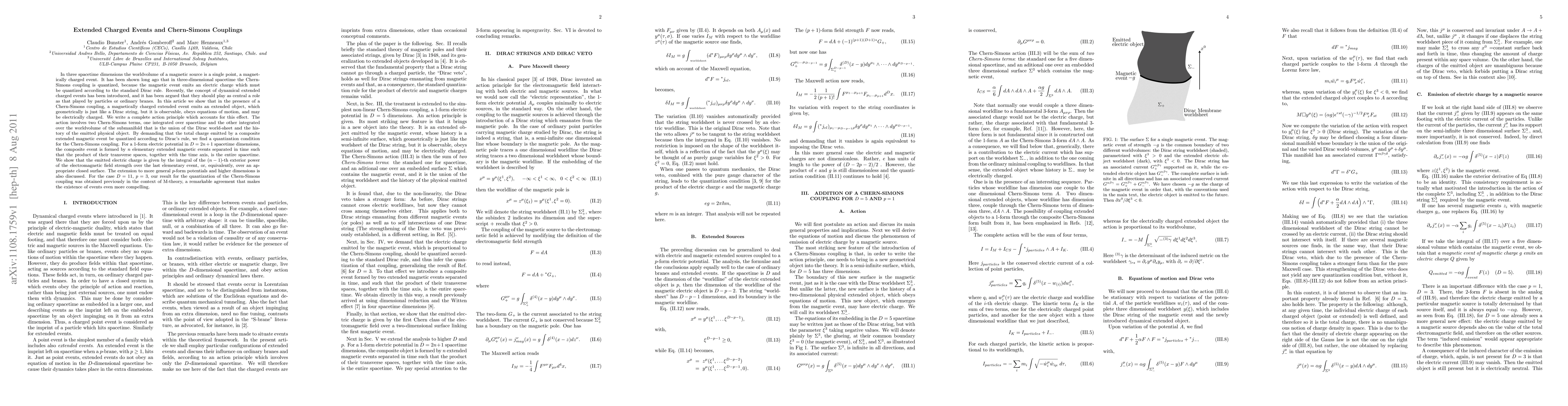 This paper introduces dynamical extended charged events and demonstrates their role in Chern-Simons couplings, showing that such events emit observable, electrically charged objects akin to Dirac strings. The study proposes a complete action principle involving Chern-Simons terms and derives a quantization condition for the coupling based on Dirac's rule.