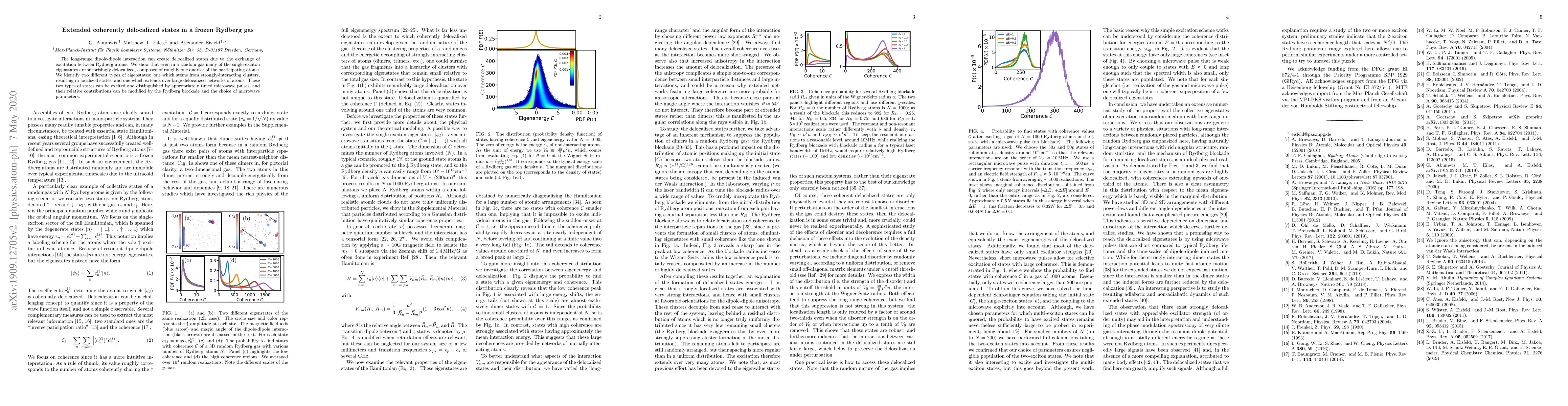 The long-range dipole-dipole interaction can create delocalized states due to the exchange of excitation between Rydberg atoms. We show that even in a random gas many of the single-exciton eigenstates are surprisingly delocalized, composed of roughly one quarter of the participating atoms. We identify two different types of eigenstates: one which stems from strongly-interacting clusters, resulting in localized states, and one which extends over large delocalized networks of atoms. These two types of states can be excited and distinguished by appropriately tuned microwave pulses, and their relative contributions can be modified by the Rydberg blockade and the choice of microwave parameters.