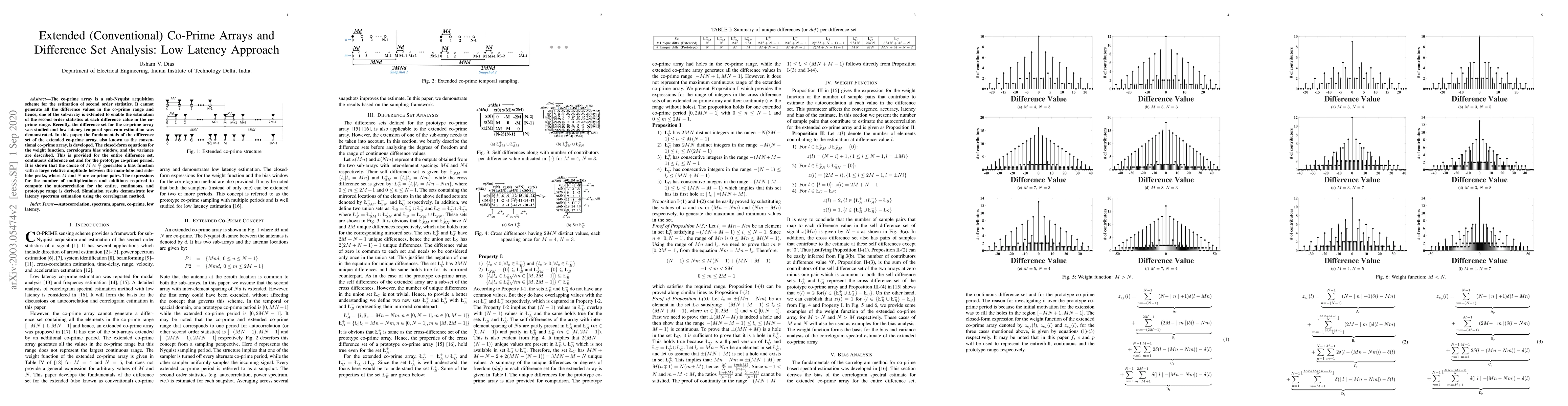 This paper develops the fundamentals of extended co-prime arrays for sub-Nyquist signal estimation, providing closed-form equations for the weight function and variance. It demonstrates low latency spectrum estimation using the correlogram method, showing that choosing $M\approx \frac{N}{2}$ optimizes the bias function for better signal processing performance.