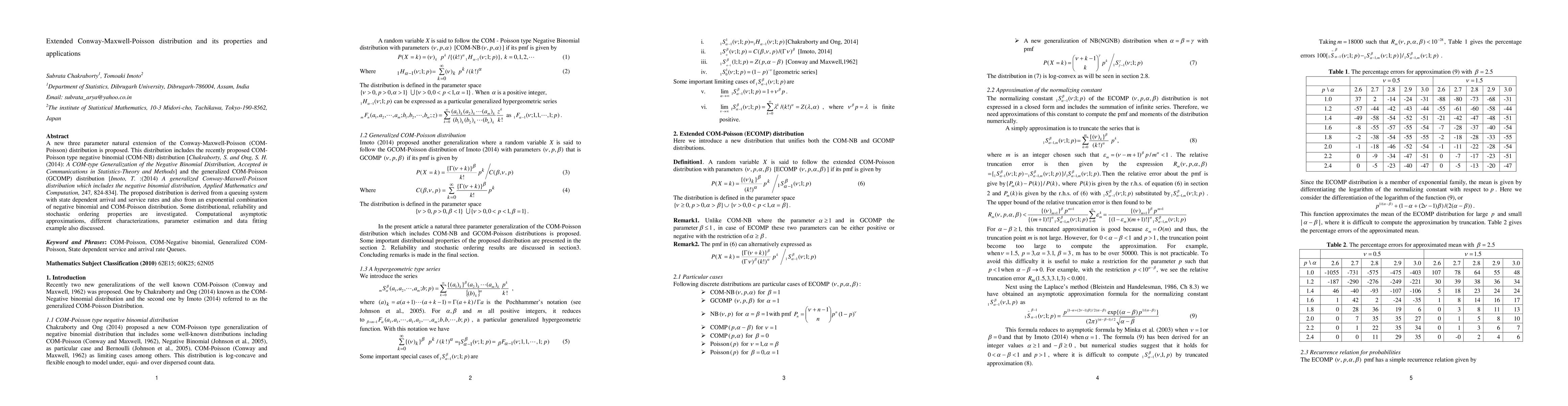 A new three parameter natural extension of the Conway-Maxwell-Poisson (COM-Poisson) distribution is proposed. This distribution includes the recently proposed COM-Poisson type negative binomial (COM-NB) distribution [Chakraborty, S. and Ong, S. H. (2014): A COM-type Generalization of the Negative Binomial Distribution, Accepted in Communications in Statistics-Theory and Methods] and the generalized COM-Poisson (GCOMP) distribution [Imoto, T. :(2014) A generalized Conway-Maxwell-Poisson distribution which includes the negative binomial distribution, Applied Mathematics and Computation, 247, 824-834]. The proposed distribution is derived from a queuing system with state dependent arrival and service rates and also from an exponential combination of negative binomial and COM-Poisson distribution. Some distributional, reliability and stochastic ordering properties are investigated. Computational asymptotic approximations, different characterizations, parameter estimation and data fitting example also discussed.