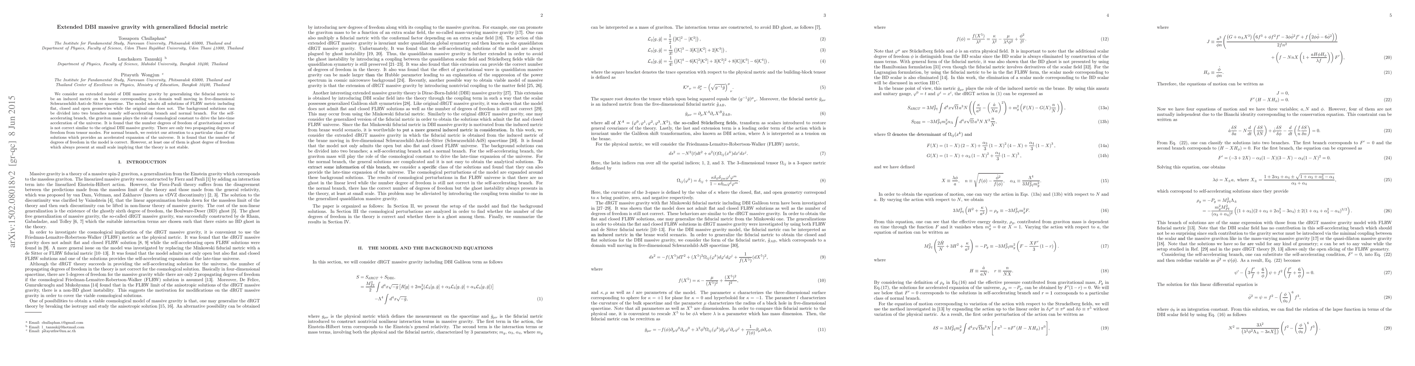 The research extends DBI massive gravity by generalizing the fiducial metric, allowing solutions for FLRW metrics including flat, closed, and open geometries. While self-accelerating branch with a graviton mass as cosmological constant provides late-time acceleration, the model has only two tensor propagating degrees of freedom, unlike the original. The normal branch, offering accelerated expansion, correctly counts degrees of freedom but includes ghost degrees, making the theory unstable at small scales.