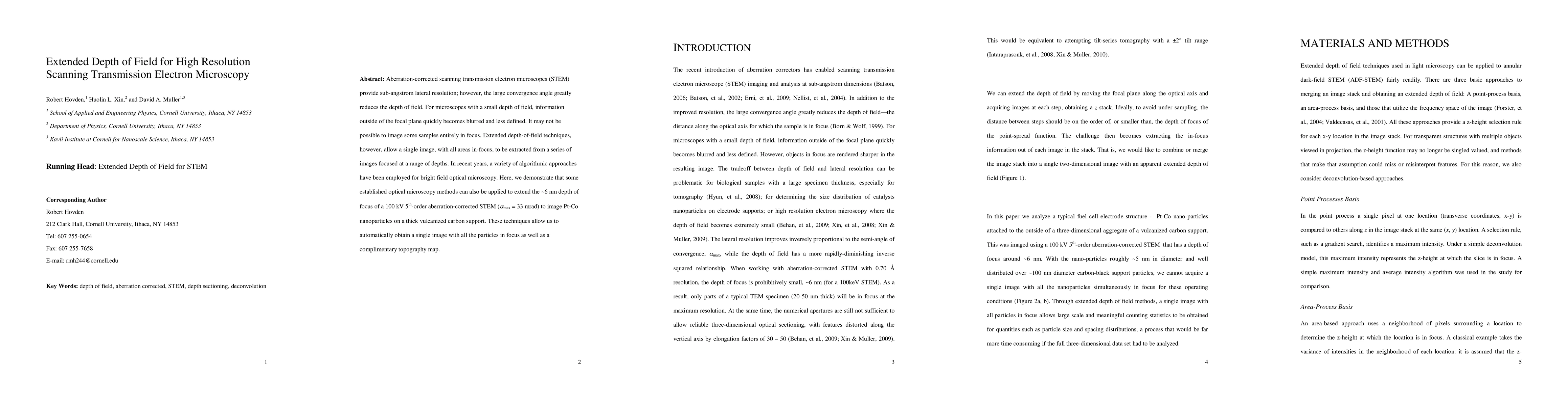 This paper explores extending the depth of field in high-resolution scanning transmission electron microscopy (STEM) to image nanoparticles in focus. It demonstrates the application of optical microscopy techniques to achieve a 6 nm depth of field in a 100 kV aberration-corrected STEM, enabling clear imaging of Pt-Co nanoparticles on a carbon support.