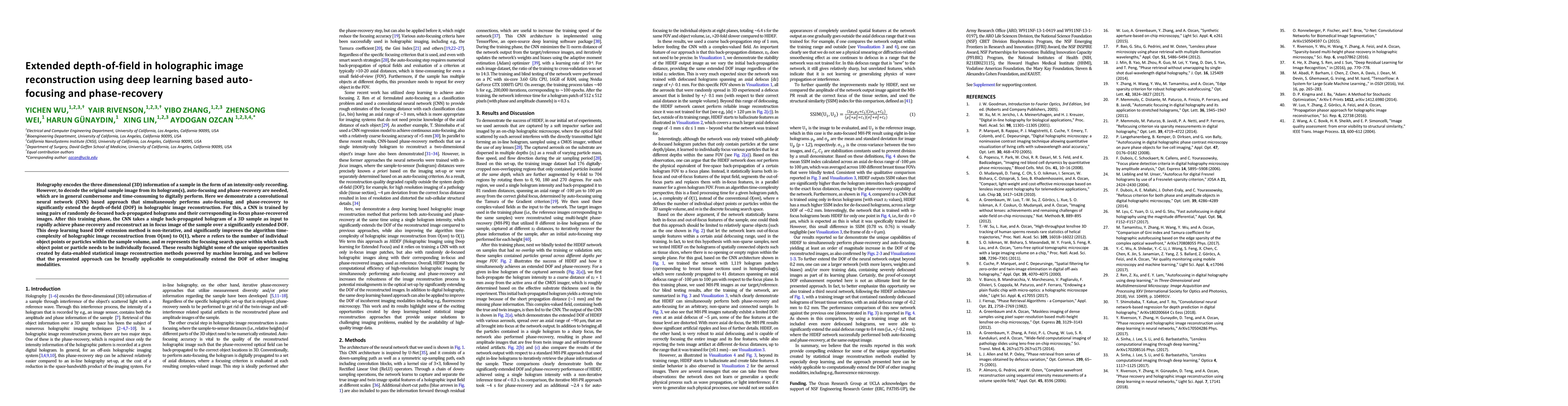 This paper presents a convolutional neural network (CNN) approach for extending the depth-of-field (DOF) in holographic image reconstruction by simultaneously performing auto-focusing and phase-recovery, significantly reducing reconstruction time complexity from O(nm) to O(1). The trained CNN rapidly reconstructs in-focus images from back-propagated holograms over an extended DOF.