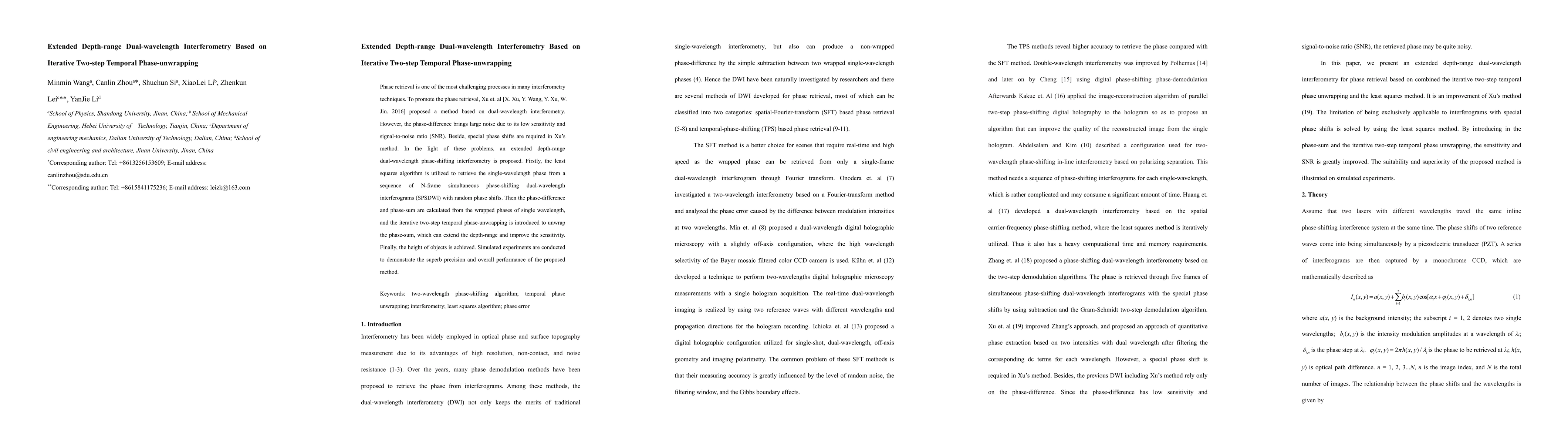 This paper proposes an extended depth-range dual-wavelength interferometry method using iterative two-step temporal phase-unwrapping to enhance phase retrieval. The method retrieves single-wavelength phase from N-frame simultaneous interferograms, calculates phase-difference and phase-sum, and employs iterative phase-unwrapping to improve sensitivity and extend depth-range, achieving precise object height.