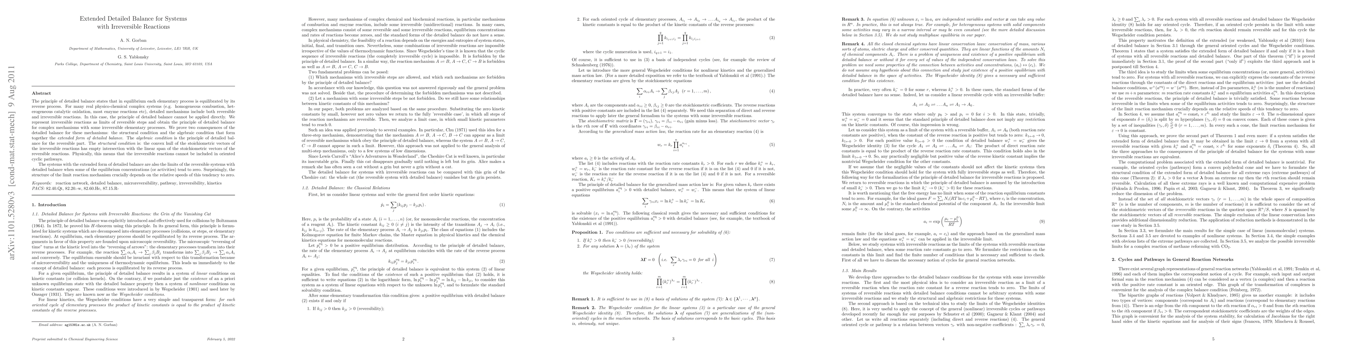 This paper extends the principle of detailed balance to complex systems with irreversible reactions by representing them as limits of reversible processes. It establishes structural and algebraic conditions forming an extended detailed balance, indicating irreversible reactions cannot form oriented pathways.