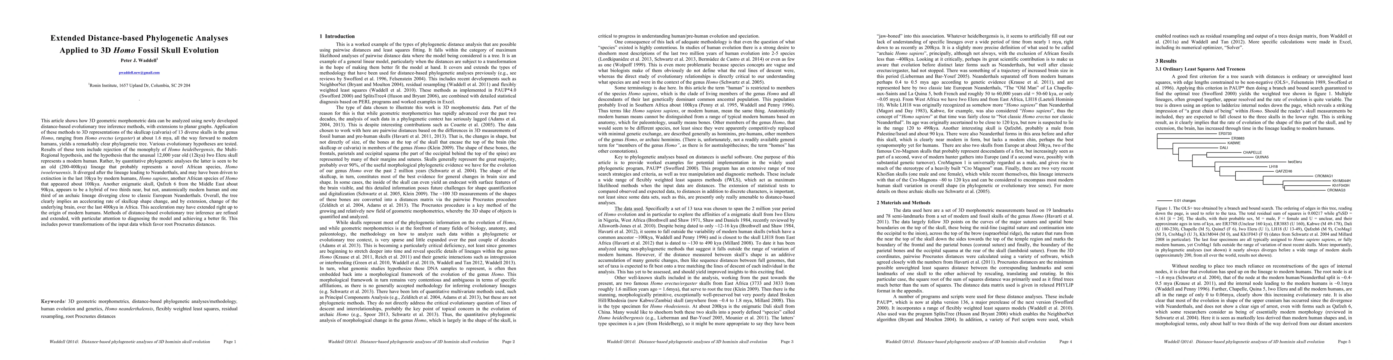 This article shows how 3D geometric morphometric data can be analyzed using newly developed distance-based evolutionary tree inference methods, with extensions to planar graphs. Application of these methods to 3D representations of the skullcap (calvaria) of 13 diverse skulls in the genus Homo, ranging from Homo erectus (ergaster) at about 1.6 mya, all the way forward to modern humans, yields a remarkably clear phylogenetic tree. Various evolutionary hypotheses are tested. Results of these tests include rejection of the monophyly of Homo heidelbergensis, the Multi-Regional hypothesis, and the hypothesis that the unusual 12,000 year old (12kya) Iwo Eleru skull represents a modern human. Rather, by quantitative phylogenetic analyses the latter is seen to be an old (200-400kya) lineage that probably represents a novel African species, Homo iwoelerueensis. It diverged after the lineage leading to Neanderthals, and may have been driven to extinction in the last 10kya by modern humans, Homo sapiens, another African species of Homo that appeared about 100kya. Another enigmatic skull, Qafzeh 6 from the Middle East about 90kya, appears to be a hybrid of two thirds near, but not, anatomically modern human and one third of an archaic lineage diverging close to classic European Neanderthals. Overall, the tree clearly implies an accelerating rate of skullcap shape change, and by extension, change of the underlying brain, over the last 400kya in Africa. This acceleration may have extended right up to the origin of modern humans. Methods of distance-based evolutionary tree inference are refined and extended, with particular attention to diagnosing the model and achieving a better fit. This includes power transformations of the input data which favor root Procrustes distances.