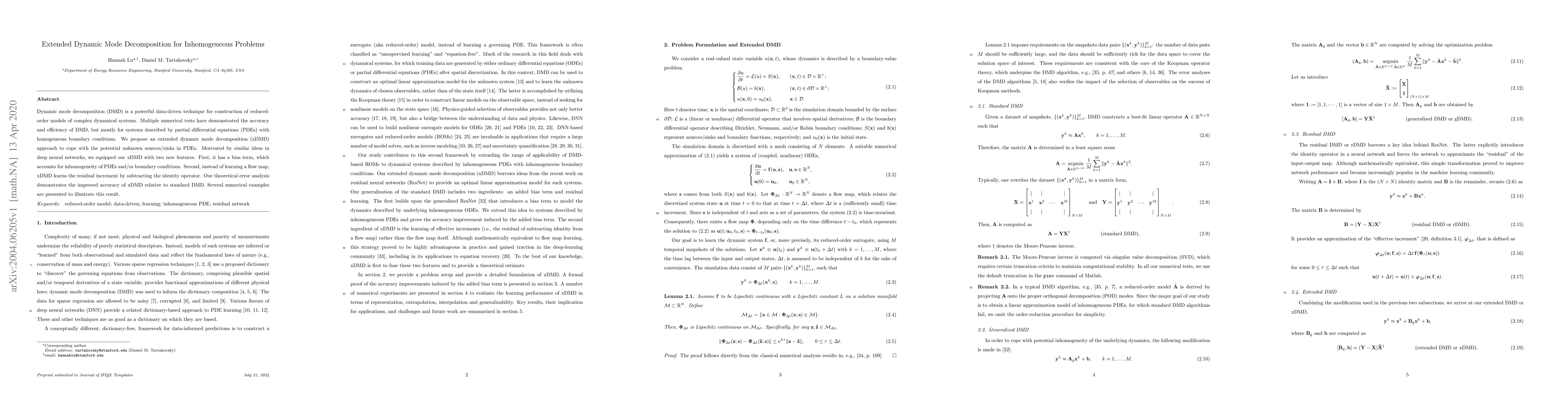 The research proposes an Extended Dynamic Mode Decomposition (xDMD) approach for handling inhomogeneities in Partial Differential Equations (PDEs) with non-homogeneous boundary conditions. xDMD incorporates a bias term to account for such inhomogeneities and learns the residual increment instead of the flow map, improving accuracy over standard DMD.