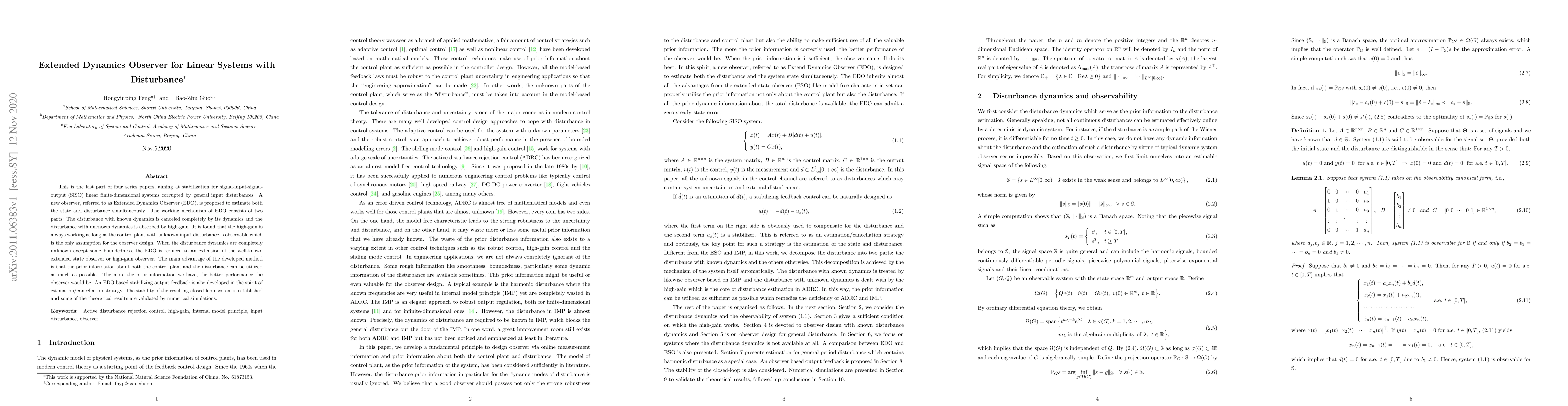 This is the last part of four series papers, aiming at stabilization for signal-input-signaloutput (SISO) linear finite-dimensional systems corrupted by general input disturbances. A new observer, referred to as Extended Dynamics Observer (EDO), is proposed to estimate both the state and disturbance simultaneously. The working mechanism of EDO consists of two parts: The disturbance with known dynamics is canceled completely by its dynamics and the disturbance with unknown dynamics is absorbed by high-gain. It is found that the high-gain is always working as long as the control plant with unknown input disturbance is observable which is the only assumption for the observer design. When the disturbance dynamics are completely unknown except some boundedness, the EDO is reduced to an extension of the well-known extended state observer or high-gain observer. The main advantage of the developed method is that the prior information about both the control plant and the disturbance can be utilized as much as possible. The more the prior information we have, the better performance the observer would be. An EDO based stabilizing output feedback is also developed in the spirit of estimation/cancellation strategy. The stability of the resulting closed-loop system is established and some of the theoretical results are validated by numerical simulations.