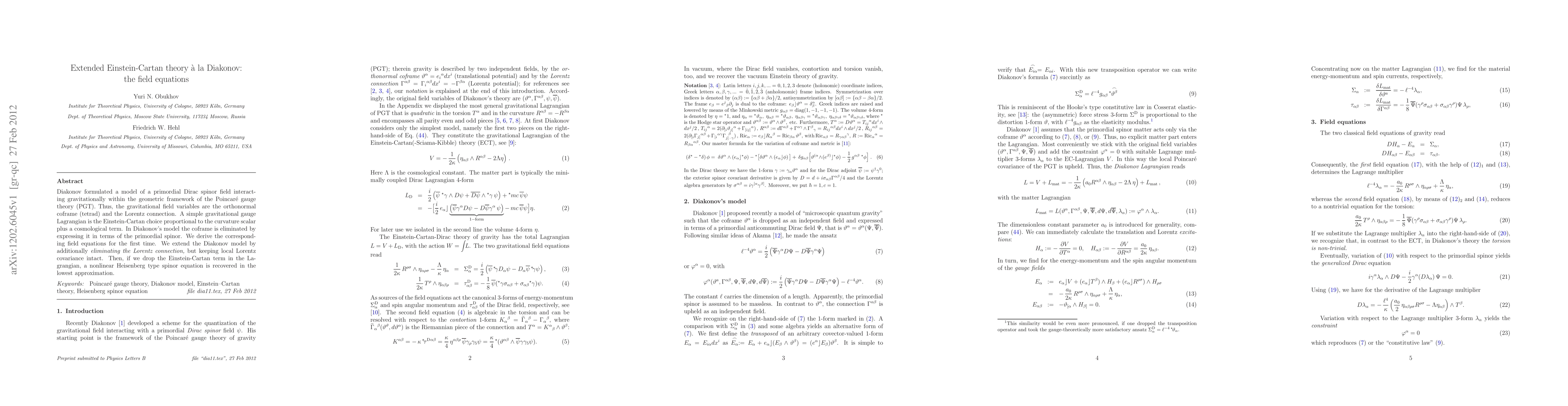 Diakonov formulated a model of a primordial Dirac spinor field interacting gravitationally within the geometric framework of the Poincar\'e gauge theory (PGT). Thus, the gravitational field variables are the orthonormal coframe (tetrad) and the Lorentz connection. A simple gravitational gauge Lagrangian is the Einstein-Cartan choice proportional to the curvature scalar plus a cosmological term. In Diakonov's model the coframe is eliminated by expressing it in terms of the primordial spinor. We derive the corresponding field equations for the first time. We extend the Diakonov model by additionally eliminating the Lorentz connection, but keeping local Lorentz covariance intact. Then, if we drop the Einstein-Cartan term in the Lagrangian, a nonlinear Heisenberg type spinor equation is recovered in the lowest approximation.
