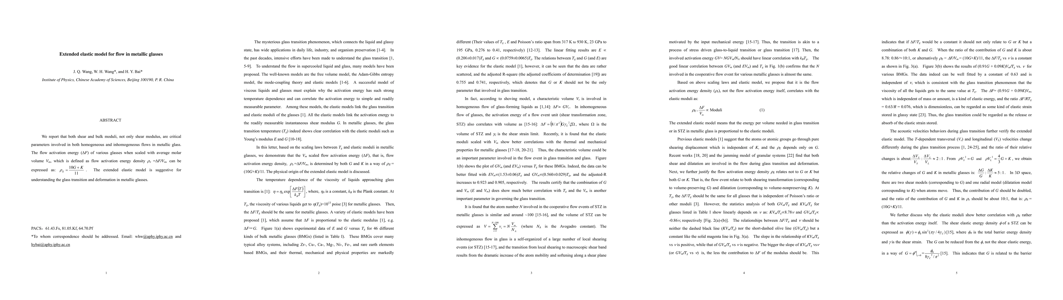 This paper proposes an extended elastic model highlighting the importance of both shear and bulk moduli in understanding flow in metallic glasses, suggesting that flow activation energy density can be expressed as D=(10G+K)/11, providing insights into the glass transition and deformation mechanisms.