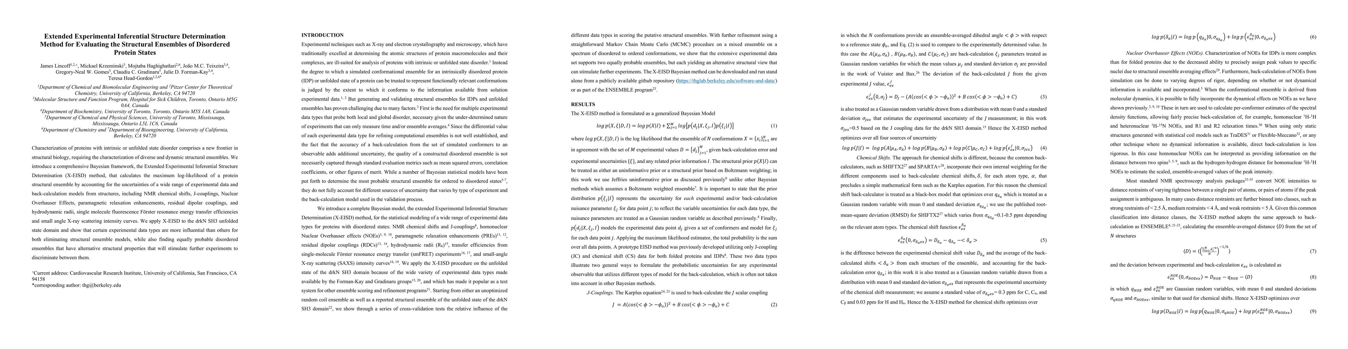 The paper introduces the X-EISD method, a Bayesian framework for evaluating structural ensembles of disordered proteins, integrating multiple experimental data types to determine the most likely protein structures. Applied to the drkN SH3 unfolded state domain, the method identifies influential data types and equally probable disordered ensembles, guiding further experimental discrimination.