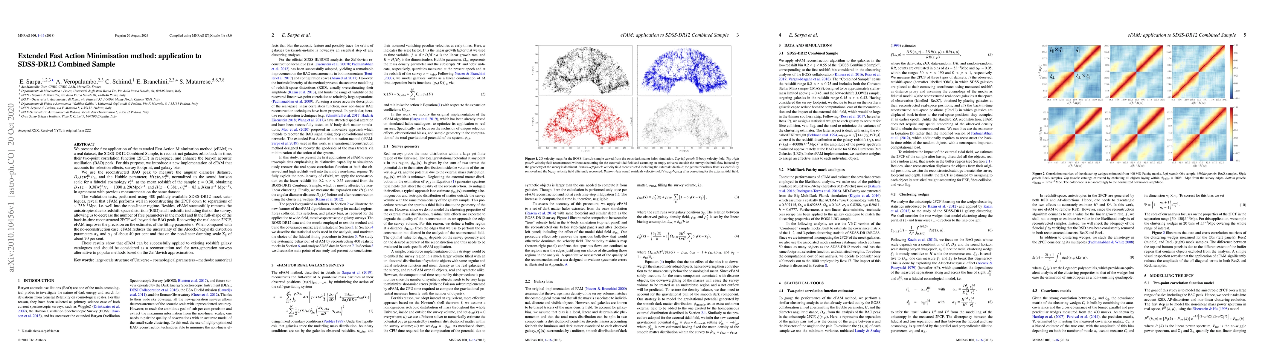 We present the first application of the extended Fast Action Minimization method (eFAM) to a real dataset, the SDSS-DR12 Combined Sample, to reconstruct galaxies orbits back-in-time, their two-point correlation function (2PCF) in real-space, and enhance the baryon acoustic oscillation (BAO) peak. For this purpose, we introduce a new implementation of eFAM that accounts for selection effects, survey footprint, and galaxy bias. We use the reconstructed BAO peak to measure the angular diameter distance, D_A(z)r^{fid}_s/r_s, and the Hubble parameter, H(z)r_s/r^{fid}_s, normalized to the sound horizon scale for a fiducial cosmology r^{fid}_s, at the mean redshift of the sample z=0.38, obtaining D_A(z=0.38)r^{fid}_s/r_s=1090 +/- 29 (Mpc)^{-1}, and H(z=0.38)r_s}/r^{fid}_s=83 +/- 3 (km s^{-1}Mpc^{-1}), in agreement with previous measurements on the same dataset. The validation tests, performed using 400 publicly available SDSS-DR12 mock catalogues, reveal that eFAM performs well in reconstructing the 2PCF down to separations of 25h^{-1}Mpc$, i.e. well into the non-linear regime. Besides, eFAM successfully removes the anisotropies due to redshift-space distortion at all redshifts including that of the survey, allowing us to decrease the number of free parameters in the model and fit the full-shape of the back-in-time reconstructed 2PCF well beyond the BAO peak. Recovering the real-space 2PCF, eFAM improves the precision on the estimates of the fitting parameters. When compared with the no-reconstruction case, eFAM reduces the uncertainty of the Alcock-Paczynski distortion parameters of about 40% and that on the non-linear damping scale of about 70%. These results show that eFAM can be successfully applied to existing redshift galaxy catalogues and should be considered as a reconstruction tool for next-generation surveys alternative to popular methods based on the Zel'dovich approximation.