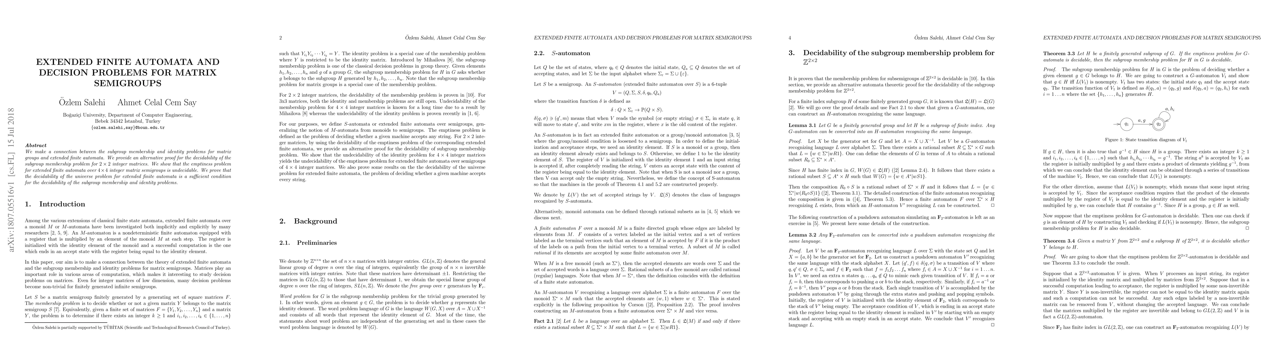 We make a connection between the subgroup membership and identity problems for matrix groups and extended finite automata. We provide an alternative proof for the decidability of the subgroup membership problem for $ 2 \times 2 $ integer matrices. We show that the emptiness problem for extended finite automata over $ 4 \times 4 $ integer matrix semigroups is undecidable. We prove that the decidability of the universe problem for extended finite automata is a sufficient condition for the decidability of the subgroup membership and identity problems.