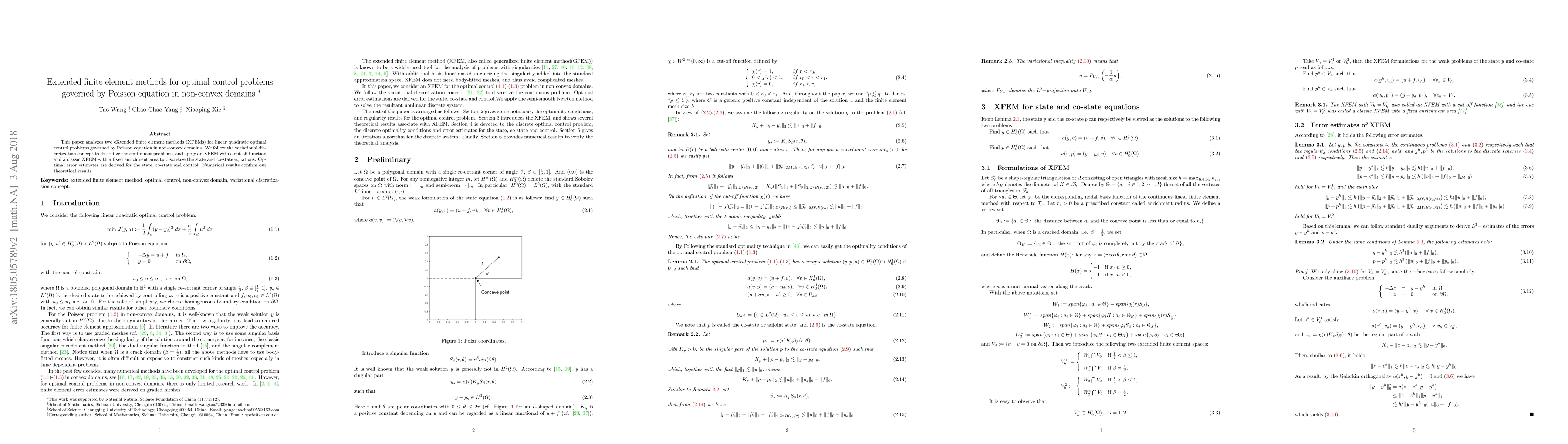This paper investigates two extended finite element methods for solving optimal control problems governed by Poisson equations in non-convex domains. The authors derive optimal error estimates and validate their methods with numerical results, confirming the theoretical findings.