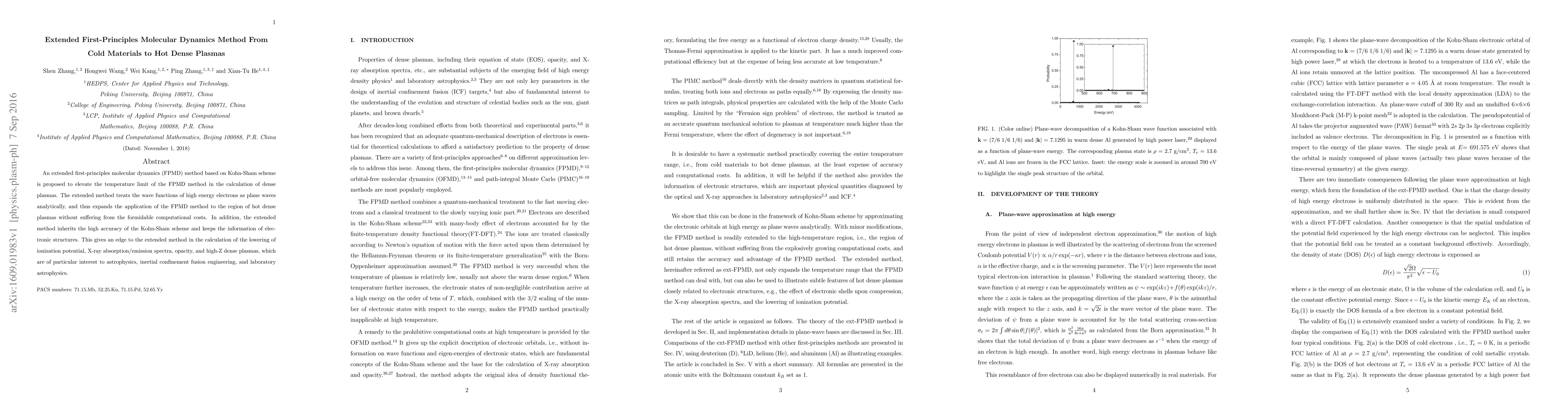 This paper proposes an extended first-principles molecular dynamics method based on the Kohn-Sham scheme to extend the temperature range for calculations of dense plasmas. The method treats high-energy electrons as plane waves, reducing computational costs and maintaining high accuracy for applications in astrophysics and fusion engineering.