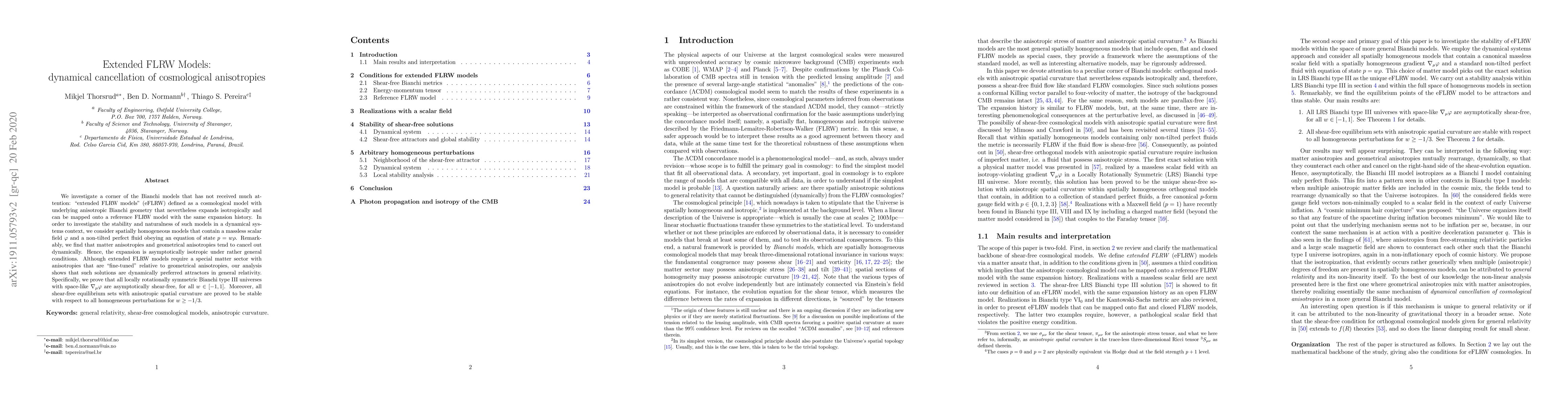 This paper explores extended FLRW models, which exhibit isotropic expansion despite underlying anisotropic Bianchi geometry. It finds that matter and geometrical anisotropies dynamically cancel out, leading to asymptotically isotropic expansion under general conditions, indicating these models are dynamically preferred attractors in general relativity.