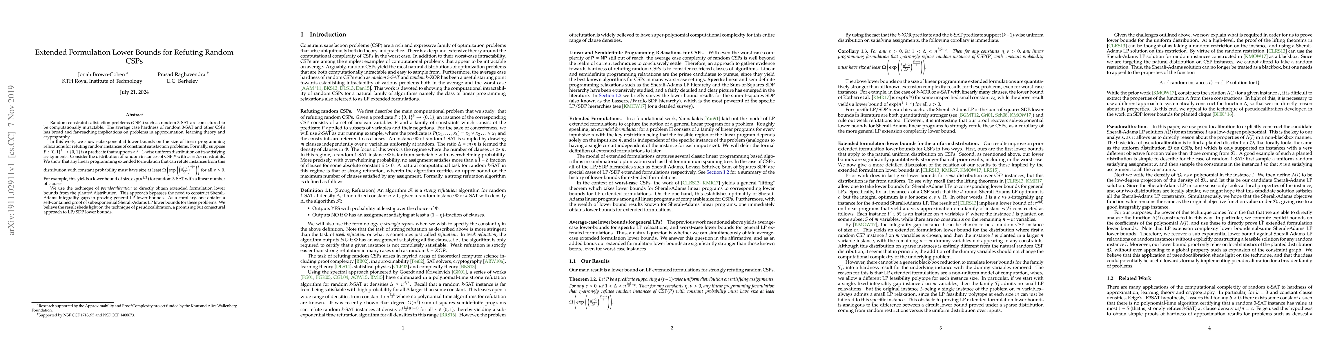 This paper establishes subexponential lower bounds on the size of linear programming relaxations for refuting random instances of constraint satisfaction problems, demonstrating that any such linear programming extended formulation must have size at least $\Omega\left(\exp\left(\left(\frac{n^{t-2}}{\Delta^2}\right)^{\frac{1-\nu}{k}}\right)\right)$. The authors use pseudocalibration to derive these results, offering a self-contained proof of subexponential Sherali-Adams LP lower bounds.