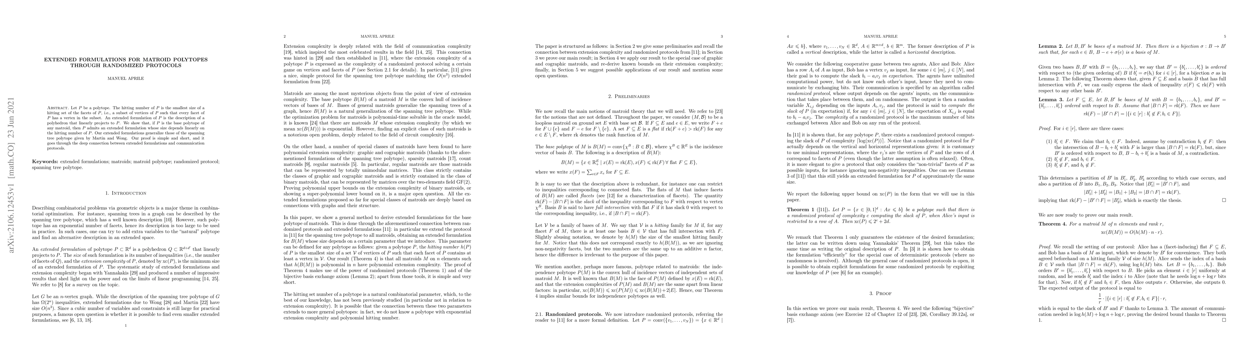 This paper demonstrates that the base polytope of any matroid can be described by an extended formulation whose size is linearly dependent on its hitting number, leveraging the connection between extended formulations and communication protocols. This generalizes previous results for the spanning tree polytope.