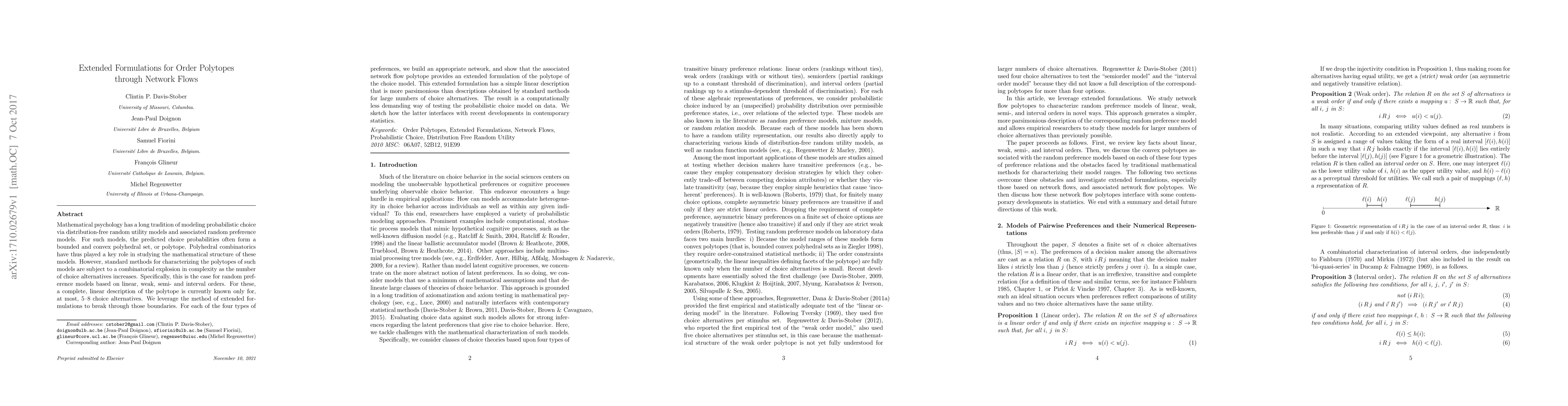 Mathematical psychology has a long tradition of modeling probabilistic choice via distribution-free random utility models and associated random preference models. For such models, the predicted choice probabilities often form a bounded and convex polyhedral set, or polytope. Polyhedral combinatorics have thus played a key role in studying the mathematical structure of these models. However, standard methods for characterizing the polytopes of such models are subject to a combinatorial explosion in complexity as the number of choice alternatives increases. Specifically, this is the case for random preference models based on linear, weak, semi- and interval orders. For these, a complete, linear description of the polytope is currently known only for, at most, 5--8 choice alternatives. We leverage the method of extended formulations to break through those boundaries. For each of the four types of preferences, we build an appropriate network, and show that the associated network flow polytope provides an extended formulation of the polytope of the choice model. This extended formulation has a simple linear description that is more parsimonious than descriptions obtained by standard methods for large numbers of choice alternatives. The result is a computationally less demanding way of testing the probabilistic choice model on data. We sketch how the latter interfaces with recent developments in contemporary statistics.