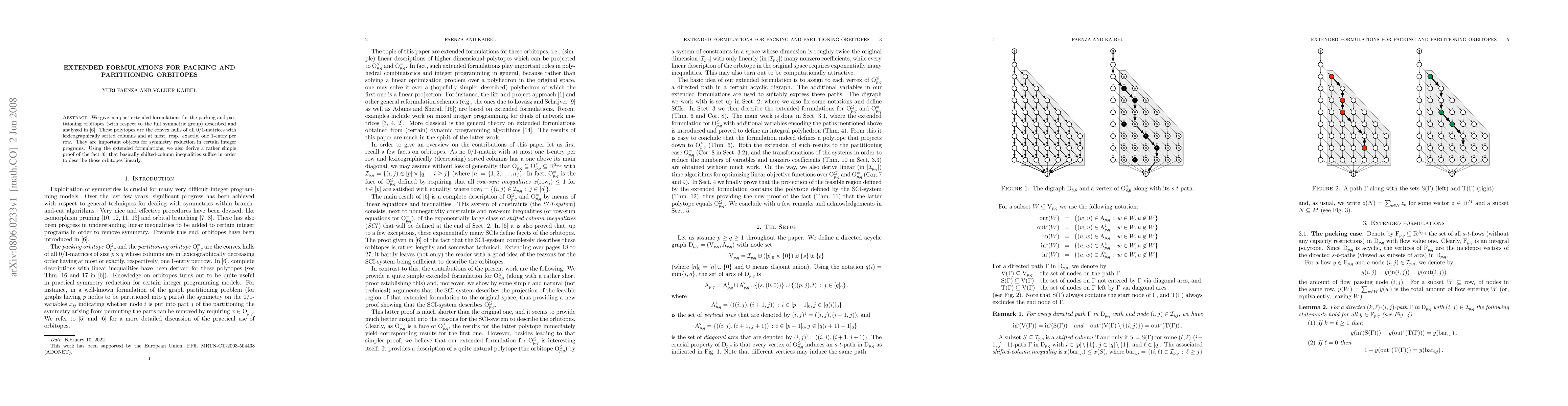 This paper provides compact extended formulations for packing and partitioning orbitopes, which are convex hulls of 0/1-matrices with specific row constraints. It also offers a straightforward proof that shifted-column inequalities are sufficient to describe these polytopes linearly.