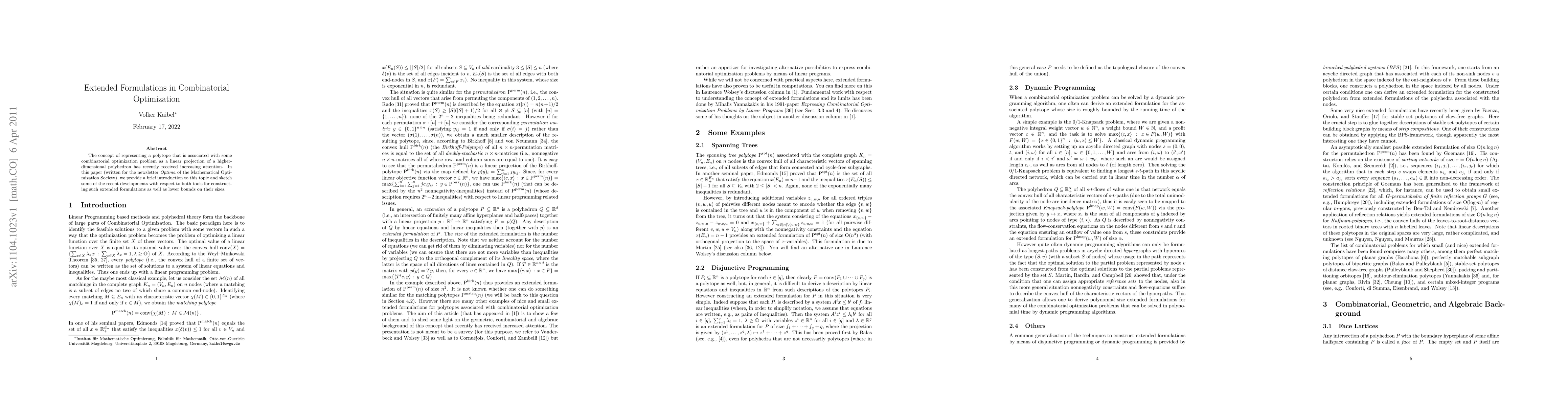 This paper introduces extended formulations in combinatorial optimization, focusing on representing optimization problem polytopes as higher-dimensional projections, and reviews recent advancements in constructing such formulations and determining their sizes.