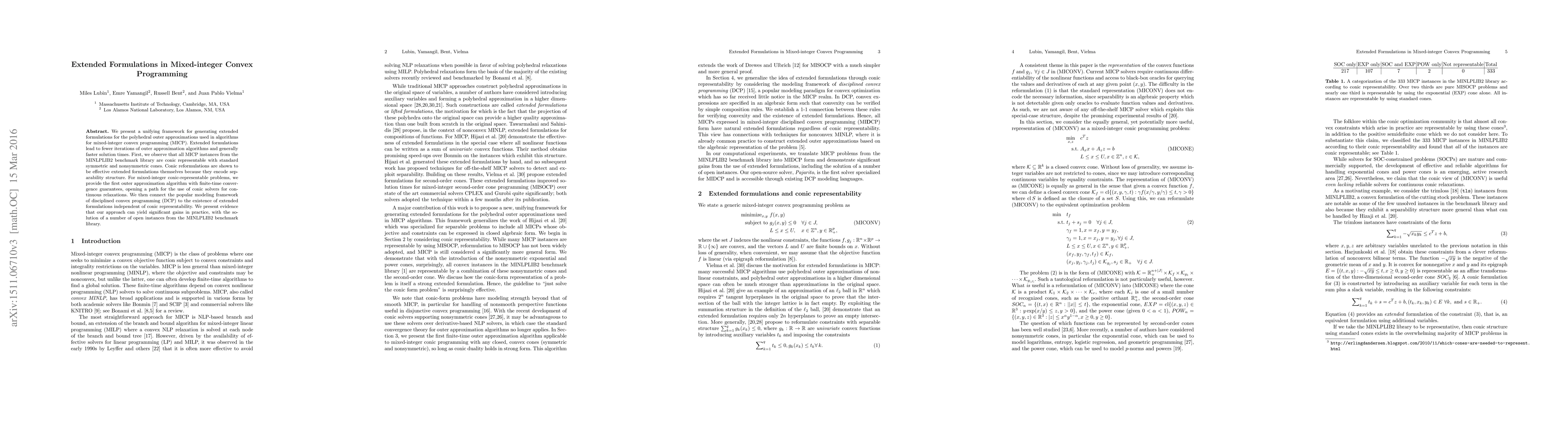 We present a unifying framework for generating extended formulations for the polyhedral outer approximations used in algorithms for mixed-integer convex programming (MICP). Extended formulations lead to fewer iterations of outer approximation algorithms and generally faster solution times. First, we observe that all MICP instances from the MINLPLIB2 benchmark library are conic representable with standard symmetric and nonsymmetric cones. Conic reformulations are shown to be effective extended formulations themselves because they encode separability structure. For mixed-integer conic-representable problems, we provide the first outer approximation algorithm with finite-time convergence guarantees, opening a path for the use of conic solvers for continuous relaxations. We then connect the popular modeling framework of disciplined convex programming (DCP) to the existence of extended formulations independent of conic representability. We present evidence that our approach can yield significant gains in practice, with the solution of a number of open instances from the MINLPLIB2 benchmark library.