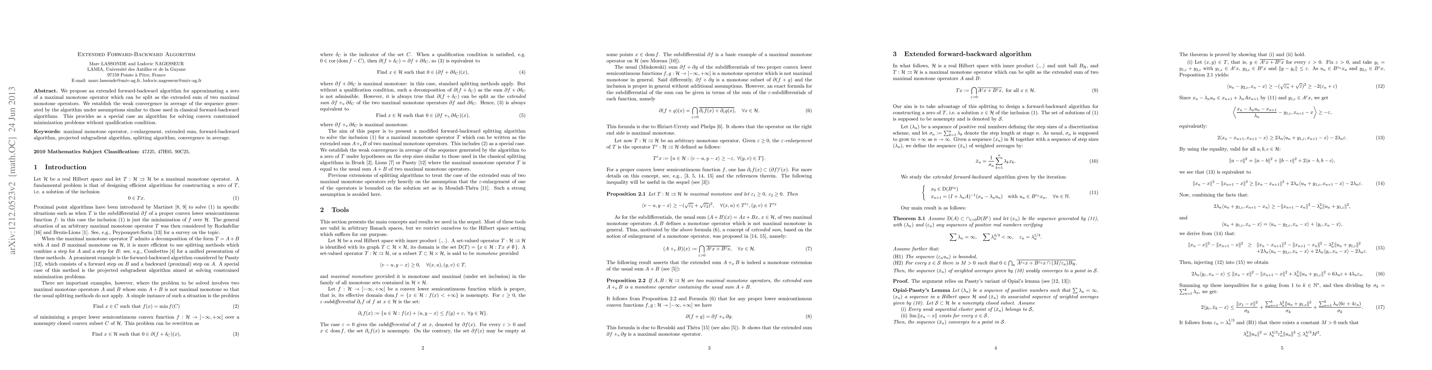 The extended forward-backward algorithm approximates zeros of maximal monotone operators split into two parts, ensuring weak convergence in average under similar assumptions. It also serves as a method for solving convex constrained minimization problems without requiring a qualification condition.