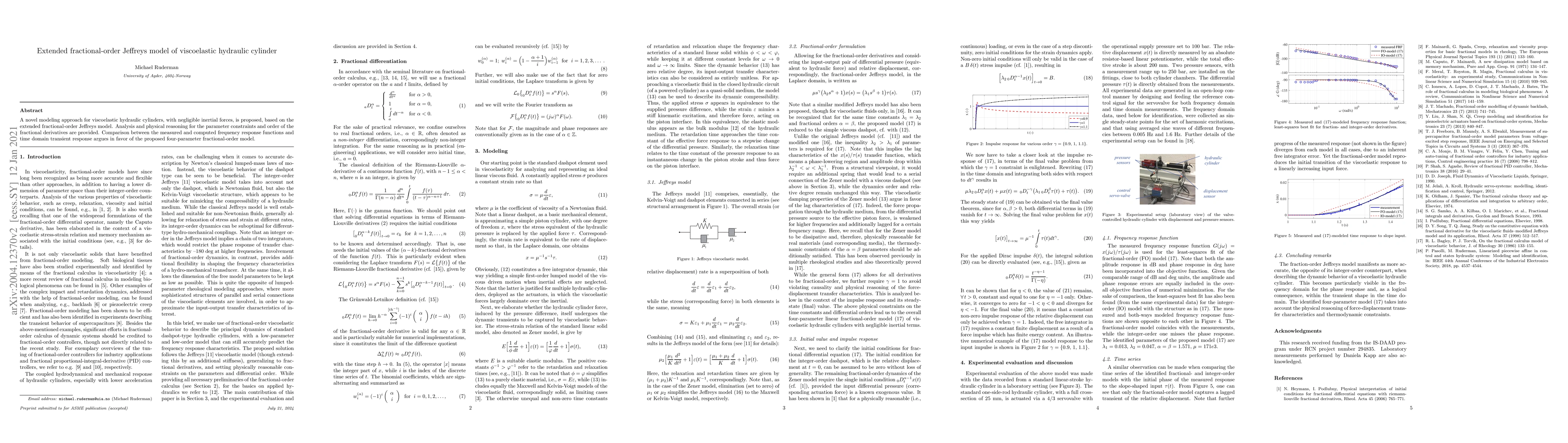 A novel modeling approach for viscoelastic hydraulic cylinders, with negligible inertial forces, is proposed, based on the extended fractional-order Jeffreys model. Analysis and physical reasoning for the parameter constraints and order of the fractional derivatives are provided. Comparison between the measured and computed frequency response functions and time domain transient response argues in favor of the proposed four-parameter fractional-order model.