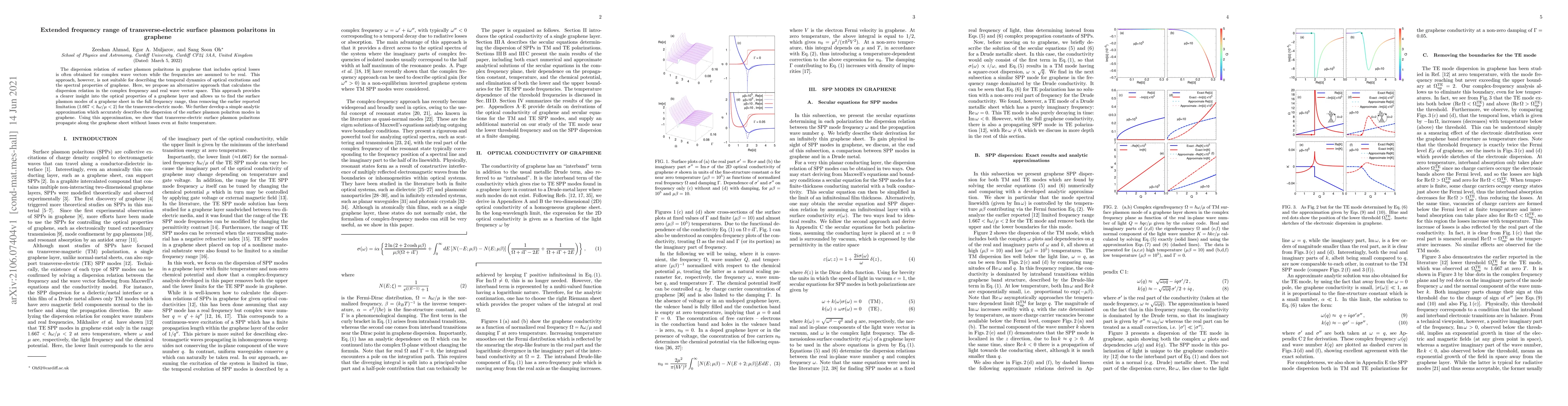 The dispersion relation of surface plasmon polaritons in graphene that includes optical losses is often obtained for complex wave vectors while the frequencies are assumed to be real. This approach, however, is not suitable for describing the temporal dynamics of optical excitations and the spectral properties of graphene. Here, we propose an alternative approach that calculates the dispersion relation in the complex frequency and real wave vector space. This approach provides a clearer insight into the optical properties of a graphene layer and allows us to find the surface plasmon modes of a graphene sheet in the full frequency range, thus removing the earlier reported limitation (1.667 < $\hbar\omega/\mu$ < 2) for the transverse-electric mode. We further develop a simple analytic approximation which accurately describes the dispersion of the surface plasmon polariton modes in graphene. Using this approximation, we show that transverse-electric surface plasmon polaritons propagate along the graphene sheet without losses even at finite temperature.