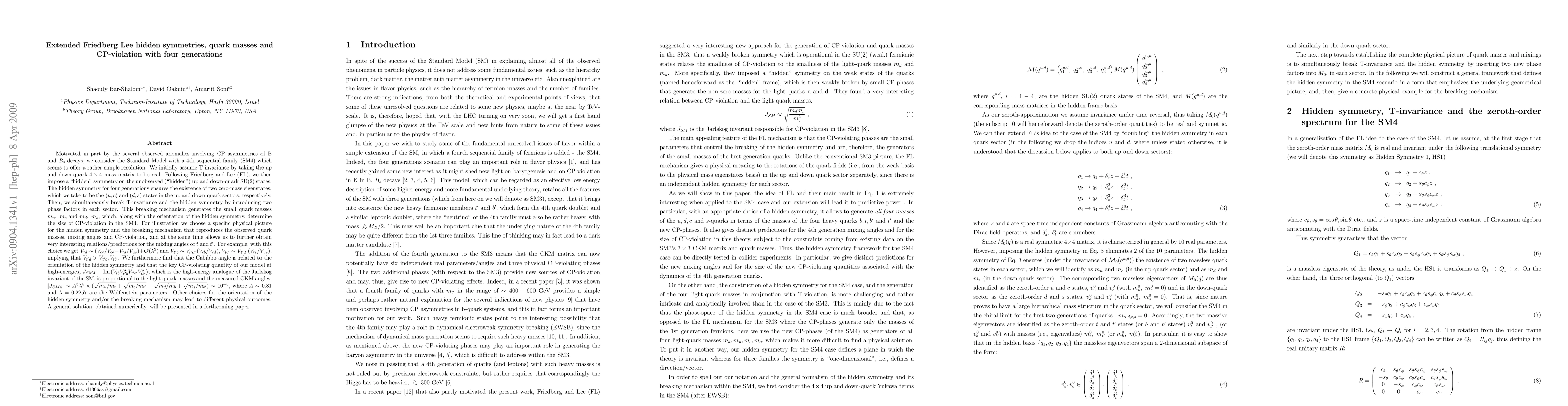 Motivated in part by the several observed anomalies involving CP asymmetries of B and B_s decays, we consider the Standard Model with a 4th sequential family (SM4) which seems to offer a rather simple resolution. We initially assume T-invariance by taking the up and down-quark 4x4 mass matrix to be real. Following Friedberg and Lee (FL), we then impose a "hidden" symmetry on the unobserved ("hidden") up and down-quark SU(2) states. The hidden symmetry for four generations ensures the existence of two zero-mass eigenstates, which we take to be the (u,c) and (d,s) states in the up and down-quark sectors, respectively. Then, we simultaneously break T-invariance and the hidden symmetry by introducing two phase factors in each sector. This breaking mechanism generates the small quark masses m_u, m_c and m_d, m_s which, along with the orientation of the hidden symmetry, determine the size of CP-violation in the SM4. For illustration we choose a specific physical picture for the hidden symmetry and the breaking mechanism that reproduces the observed quark masses, mixing angles and CP-violation, and at the same time allows us to further obtain very interesting relations/predictions for the mixing angles of t and t'. For example, with this choice we get V_{td} ~ (V_{cb}/V_{cd} - V_{ts}/V_{us}) + O(\lambda^2) and V_{t'b} ~ V_{t'd}x(V_{cb}/V_{cd}), V_{tb'} ~ V_{t'd}x(V_{ts}/V_{us}), implying that V_{t'd} > V_{t'b},V_{tb'}. We furthermore find that the Cabibbo angle is related to the orientation of the hidden symmetry and that the key CP-violating quantity of our model at high-energies, J_{SM4} = Im[V_{tb} V_{t'b}^* V_{t'b'} V_{tb'}^*], which is the high-energy analogue of the Jarlskog invariant of the SM, is proportional to the light-quark masses and the measured CKM angles.
