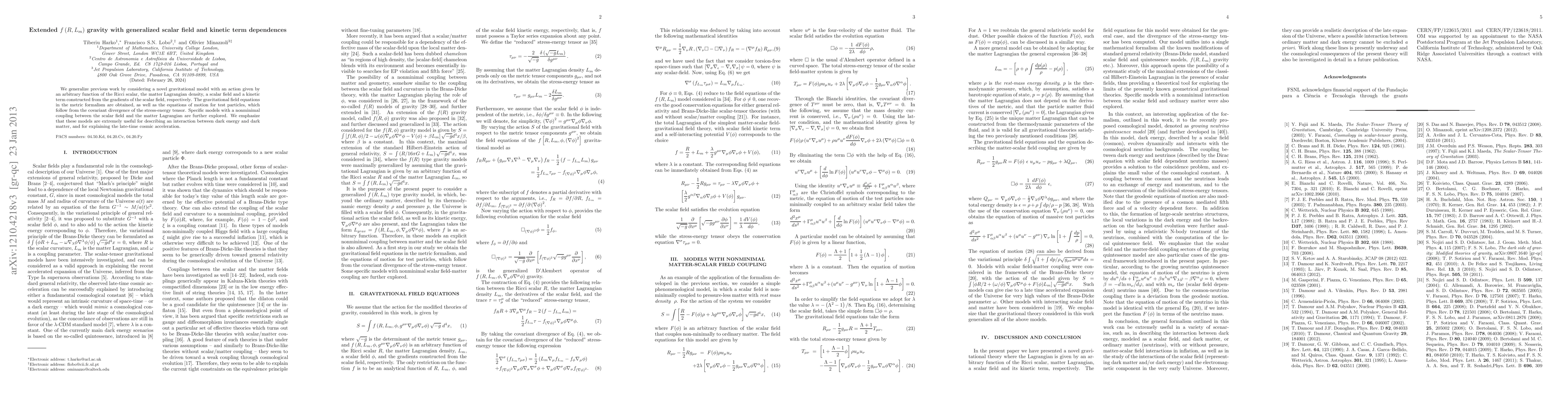 We generalize previous work by considering a novel gravitational model with an action given by an arbitrary function of the Ricci scalar, the matter Lagrangian density, a scalar field and a kinetic term constructed from the gradients of the scalar field, respectively. The gravitational field equations in the metric formalism are obtained, as well as the equations of motion for test particles, which follow from the covariant divergence of the stress-energy tensor. Specific models with a nonminimal coupling between the scalar field and the matter Lagrangian are further explored. We emphasize that these models are extremely useful for describing an interaction between dark energy and dark matter, and for explaining the late-time cosmic acceleration.