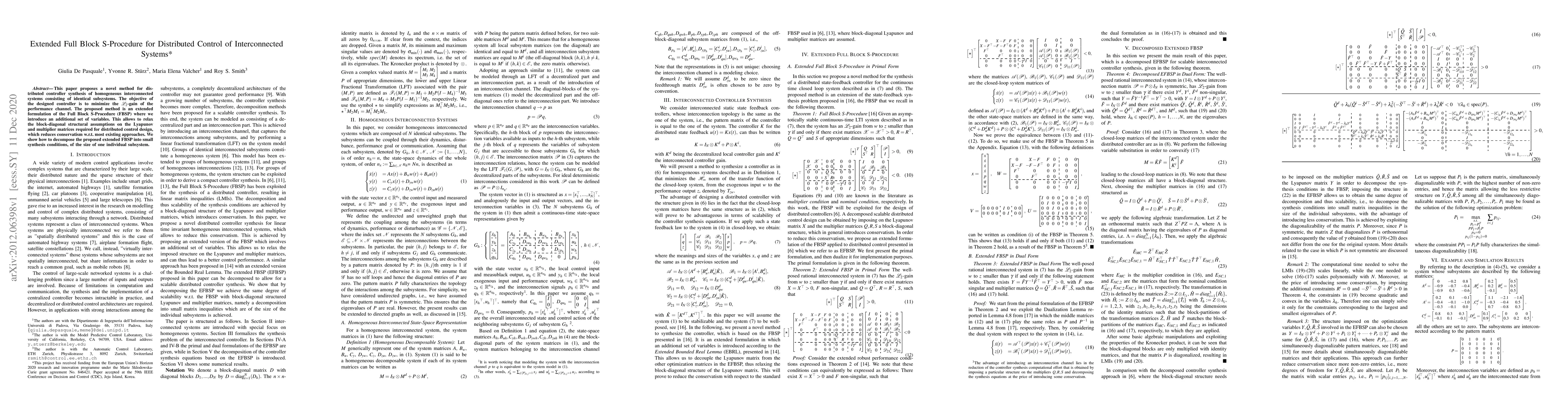 This paper introduces an extended Full Block S-Procedure for synthesizing distributed controllers for homogeneous interconnected systems, minimizing L2-gain. The method relaxes structural assumptions, reducing conservatism compared to existing approaches, and decomposes the problem into manageable subsystem-sized conditions.