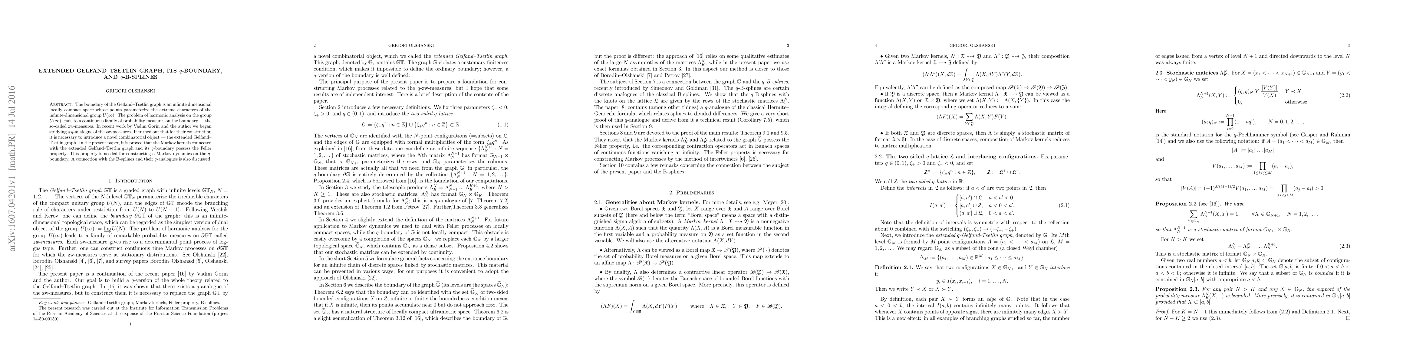 A continuation of the joint work by Vadim Gorin and the author, J. Funct. Anal. 270 (2016), 375-418; arXiv:1504.06832. The extended Gelfand-Tsetlin graph, introduced in that paper, is a novel combinatorial object. Its q-boundary is formed by infinite point configurations on a two-sided q-lattice. The q-boundary carries a continuous family of probability measures that are a q-analogue of the so-called zw-measures, which originated in the problem of harmonic analysis on the infinite-dimensional unitary group. In the present paper, it is proved that certain transition Markov kernels, linked to the extended Gelfand-Tsetlin graph and its q-boundary, possess the Feller property. This property is needed for constructing a model of Markov dynamics on the q-boundary. A connection with the classical B-splines and their q-analogues is discussed. Some results of the paper arXiv:1504.06832 are rederived in another way.
