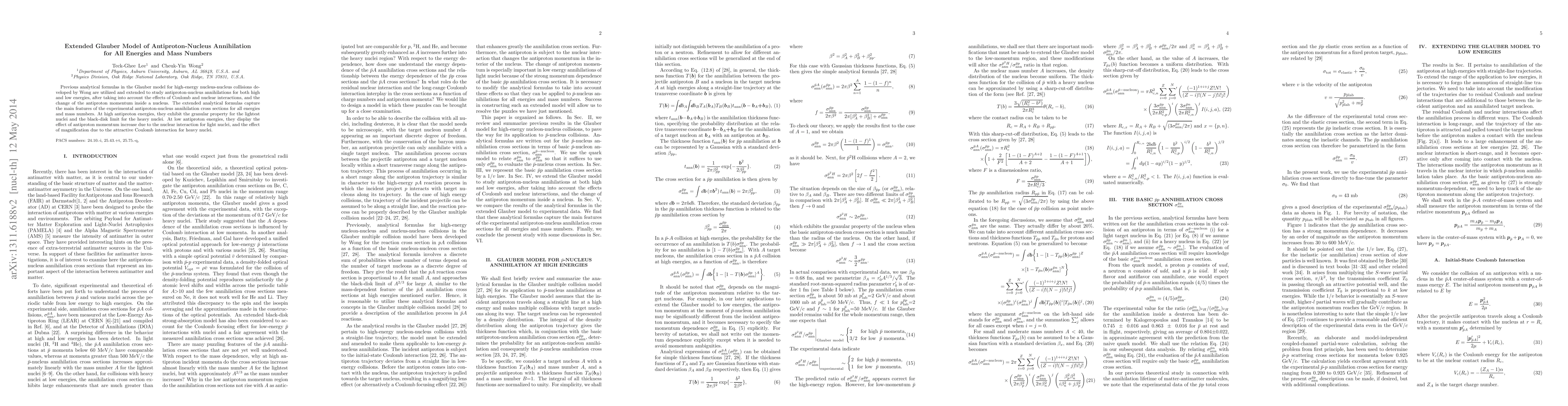 This paper extends Wong's analytical Glauber model to describe antiproton-nucleus annihilations across all energies and mass numbers, incorporating Coulomb and nuclear interactions. The extended model accurately captures experimental cross-section features, showing granular properties for light nuclei and black-disk limits for heavy nuclei at high energies, and momentum increase effects for light nuclei and magnification due to Coulomb interaction for heavy nuclei at low energies.