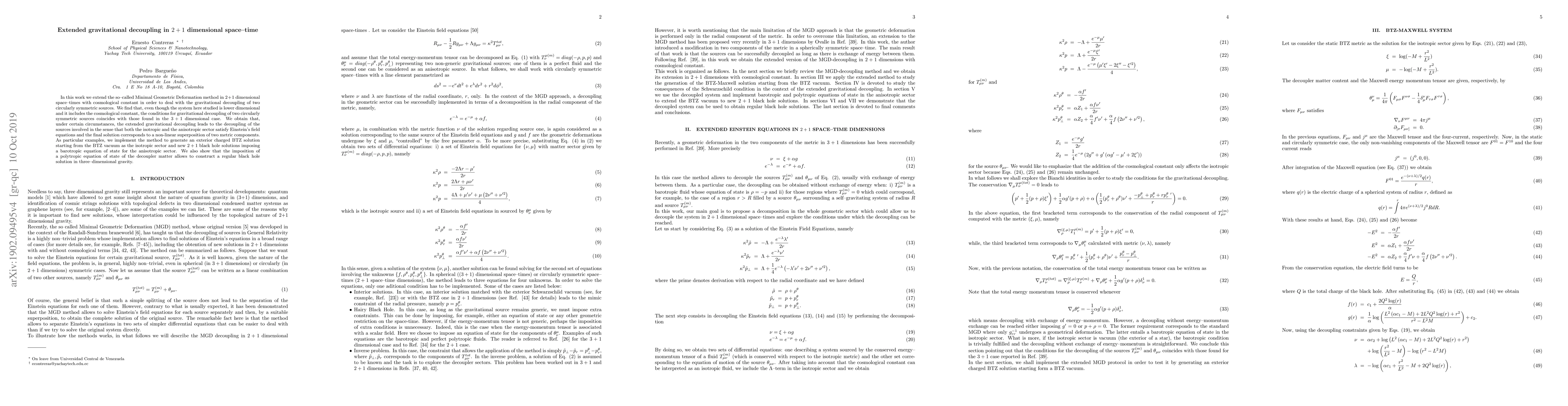 In this work we extend the so--called Minimal Geometric Deformation method in $2+1$ dimensional space--times with cosmological constant in order to deal with the gravitational decoupling of two circularly symmetric sources. We find that, even though the system here studied is lower dimensional and it includes the cosmological constant, the conditions for gravitational decoupling of two circularly symmetric sources coincides with those found in the $3+1$ dimensional case. We obtain that, under certain circumstances, the extended gravitational decoupling leads to the decoupling of the sources involved in the sense that both the isotropic and the anisotropic sector satisfy Einstein's field equations and the final solution corresponds to a non-linear superposition of two metric components. As particular examples, we implement the method to generate an exterior charged BTZ solution starting from the BTZ vacuum as the isotropic sector and new $2+1$ black hole solutions imposing a barotropic equation of state for the anisotropic sector. We also show that the imposition of a polytropic equation of state of the decoupler matter allows to construct a regular black hole solution in three--dimensional gravity.