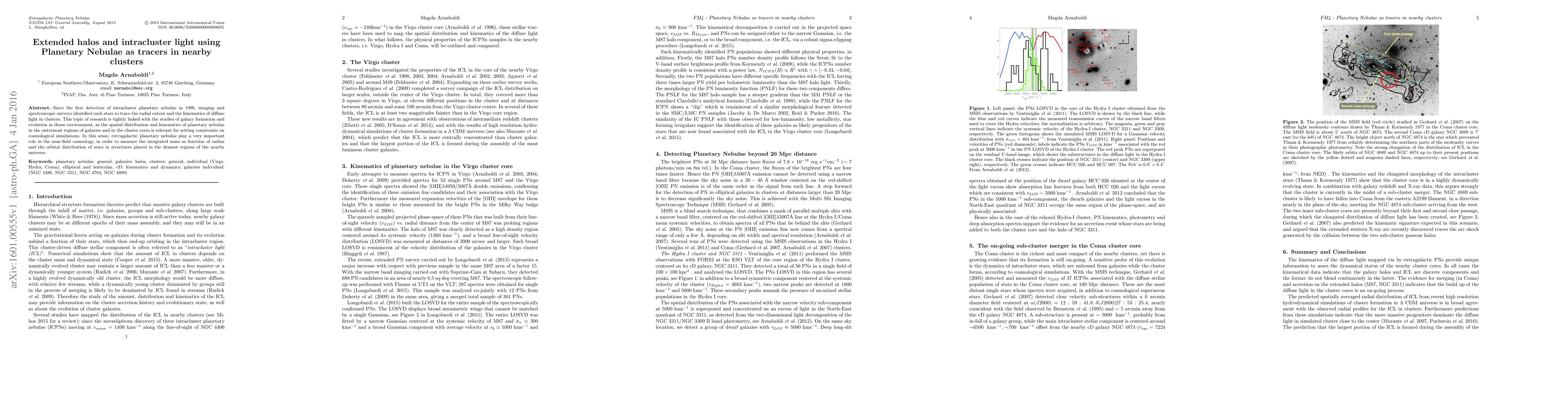 This paper investigates the use of planetary nebulae to trace the extended halos and intracluster light in nearby clusters, providing insights into the radial extent and kinematics of diffuse light. The findings contribute to understanding galaxy formation and evolution in dense environments, aiding in cosmological simulations and measuring the integrated mass and stellar orbital distribution in these regions.