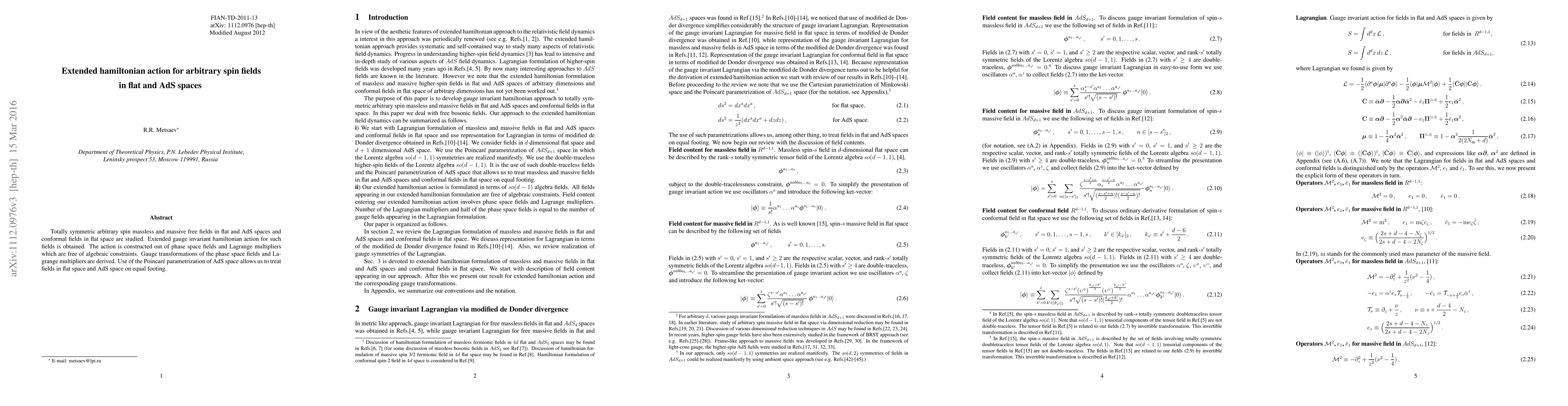 Totally symmetric arbitrary spin massless and massive free fields in flat and AdS spaces and conformal fields in flat space are studied. Extended gauge invariant hamiltonian action for such fields is obtained. The action is constructed out of phase space fields and Lagrange multipliers which are free of algebraic constraints. Gauge transformations of the phase space fields and Lagrange multipliers are derived. Use of the Poincare parametrization of AdS space allows us to treat fields in flat space and AdS space on equal footing.