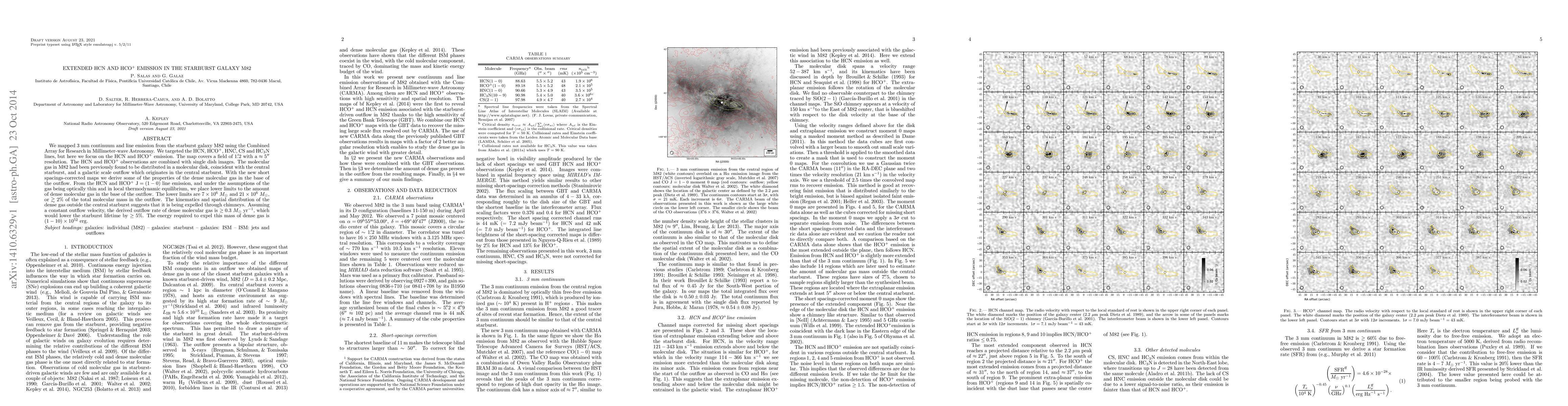 We mapped 3 mm continuum and line emission from the starburst galaxy M82 using the Combined Array for Research in Millimeter-wave Astronomy. We targeted the HCN, HCO$^{+}$, HNC, CS and HC$_{3}$N lines, but here we focus on the HCN and HCO$^{+}$ emission. The map covers a field of 1.2' with a ~5" resolution. The HCN and HCO$^{+}$ observations are combined with single dish images. The molecular gas in M82 had been previously found to be distributed in a molecular disk, coincident with the central starburst, and a galactic scale outflow which originates in the central starburst. With the new short spacings-corrected maps we derive some of the properties of the dense molecular gas in the base of the outflow. From the HCN and HCO$^{+}$ J=(1-0) line emission, and under the assumptions of the gas being optically thin and in local thermodynamic equilibrium, we place lower limits to the amount of dense molecular gas in the base of the outflow. The lower limits are $7\times10^{6}$ $M_{\odot}$ and $21\times10^{6}$ $M_{\odot}$, or $\gtrsim2\%$ of the total molecular mass in the outflow. The kinematics and spatial distribution of the dense gas outside the central starburst suggests that it is being expelled through chimneys. Assuming a constant outflow velocity, the derived outflow rate of dense molecular gas is $\geq0.3$ $M_{\odot}$ yr$^{-1}$, which would lower the starburst lifetime by $\geq5\%$. The energy required to expel this mass of dense gas is $(1-10)\times10^{52}$ erg.