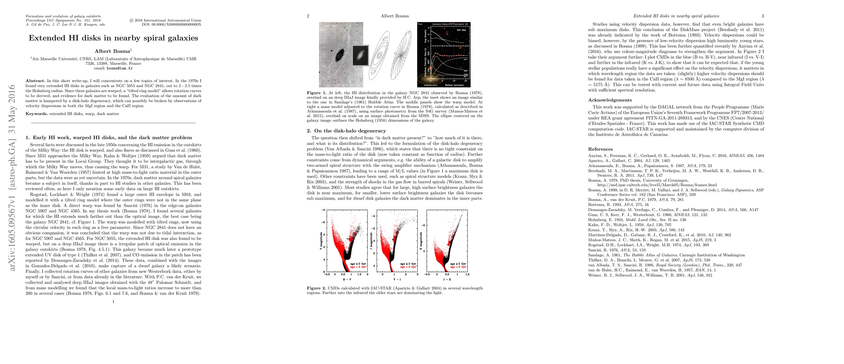 This paper investigates extended HI disks in nearby spiral galaxies like NGC 5055 and NGC 2841, revealing structures extending beyond the Holmberg radius. The tilted ring model is used to derive rotation curves, providing evidence for dark matter, though the disk-halo degeneracy complicates precise measurements, potentially resolvable through velocity dispersion observations in MgI and CaII regions.